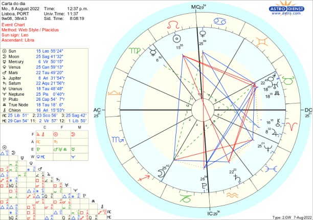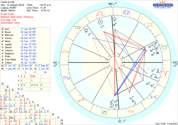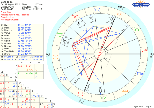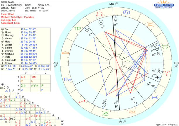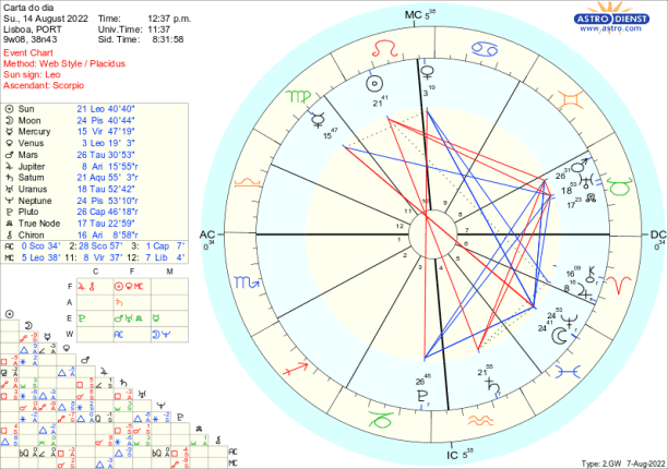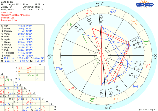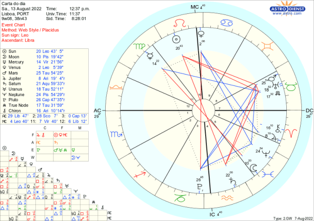 Ou seja, segunda e terça e quarta até à Lua cheia, os movimentos nos Céus preparam-nos para uma nova realidade da qual seremos agentes ou vítimas mas cujo sentido é o de nos fazer entender que não existimos autonomamente, que fazemos parte de um mundo em mudança e que temos de mudar com ele, custe o que custar, com iniciativas generosas e de impacto bem calculado dado que, tanto o Sol já em Leão, como Vénus a partir da Lua Cheia, hão de fazer oposição a Saturno em Aquário e quadraturas ao Nódulo Norte e a Urano em Touro: tensões fortes de restrição para tudo o que não for ajustado às novas exigências circunstanciais.