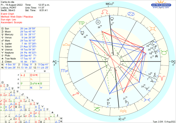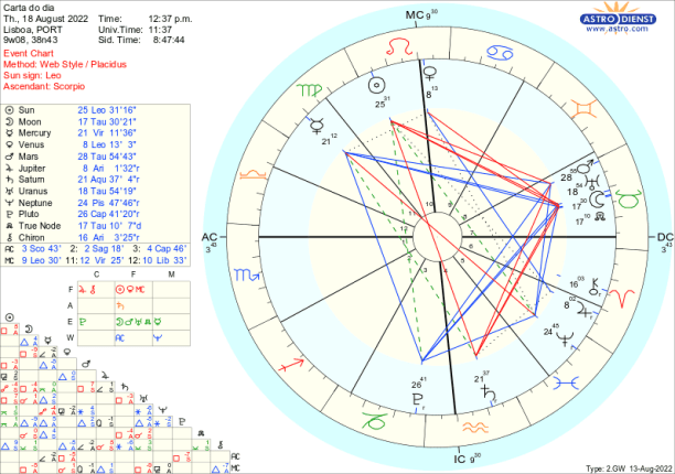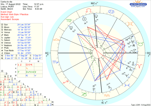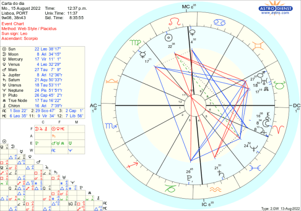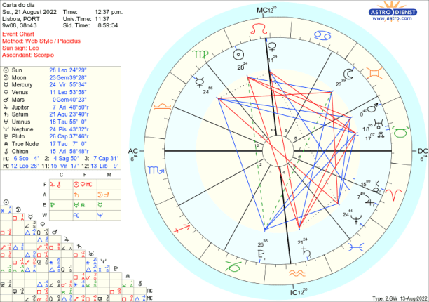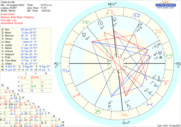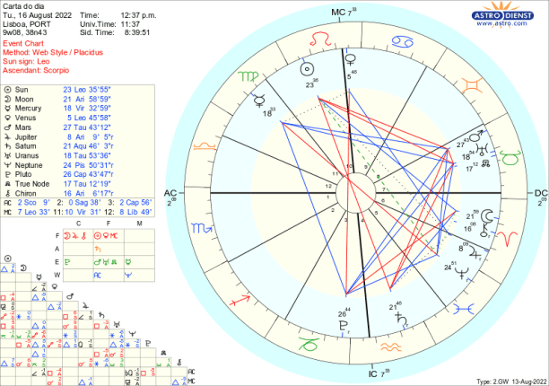 Segunda feira 14 pode ser um pouco frustrante a menos que sejemos exímios na organização das coisas. O Sol em Leão acaba a sua oposição a Saturno em Aquário e afasta-se da quadratura ao Nódulo Norte, Urano e Marte o que dá mais margem de manobra para mostrar do que somos capazes. No entanto, a a Lua em trânsito em Carneiro, conjunta a Júpiter e a Quíron revela os limites das grandes iniciativas e há que com competência e pés na Terra usar o trígono de Marte em Touro a Plutão em Capricórnio para pôr de pé o que de novo adoptamos como programa com os trânsitos dos últimos quinze dias. Mercúrio vai estar em trígono ao Nódulo Norte e por isso sabemos ao pormenor qual é agenda de trabalhos.