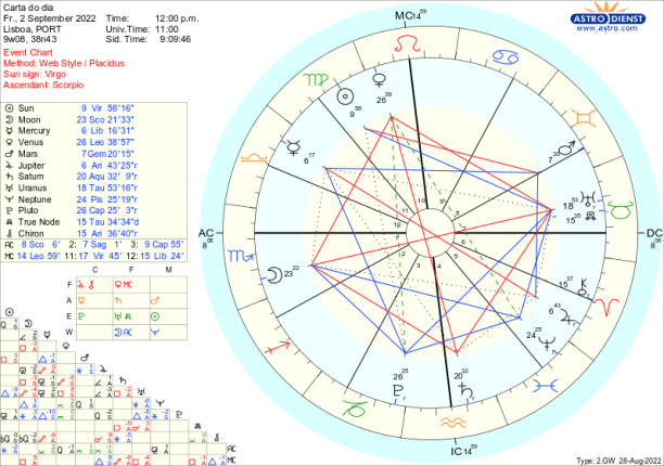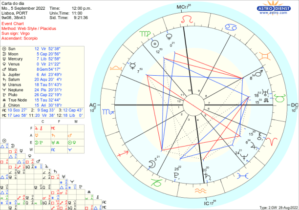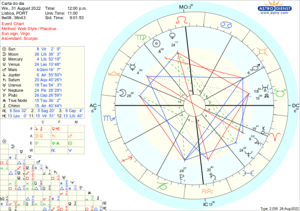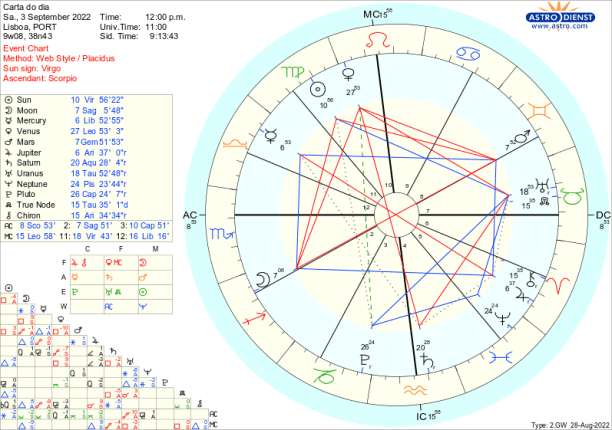 Mas Mercúrio e o que ele simboliza não é só relevante tendo em conta estas Luas Novas. Mais importante ainda, porque se trata de um raro ciclo maior, é o seu papel no excepcionalmente longo percurso de Marte em Gémeos que Mercúrio rege, para além da Virgem. Marte simboliza a acção, as lideranças políticas e militares, a agitação, as guerras ou a violência. Entrou em Gémeos no passado quarto minguante a 20 de Agosto, signo que em astrologia mundana simboliza não só a actividade dual de compra e venda dos mercados financeiros como o debate politico e o financiamento de campanhas por causas e partidos, a guerra da informação e contra-informação e a guerra aérea. Em vez de passar como habitualmente cerca de dois meses num signo, vai estar em Gémeos até Março de 2023 tornado a acção de Mercúrio um fio condutor de toda a actividade de fim de Era que até lá se vai desenrolar.