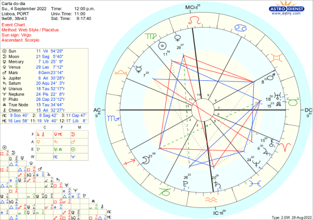 Se não quisermos esse peso de encarar crises de mudança, ou se as quisermos ir acompanhando no dia a dia, podemos ir olhando apenas, com navegação costeira, para os trânsitos imediatos. Na primeira metade desta semana, temos o Sol em Virgem em quadratura a Marte em Gémeos com Mercúrio regente de ambos em Balança em trígono gradual a Marte. São sinais de que temos de nos aplicar a fazer acontecer o que estiver na agenda de trabalhos, procurar quem possa ajudar e evitar conflitos e acidentes. Venus está a sair da oposição a Saturno e já aprendemos que uma coisa é o ego outra é o amor próprio e a generosidade. Vénus vai entrar também em Virgem no domingo 4 de Setembro e terá de ser com amor e dedicação que servimos o nosso propósito até final de Setembro. A Lua está em Balança segunda, terça e metade de quarta, enquanto dura a quadratura do Sol a Marte: encontrar compromissos é a melhor maneira de resolver tensões internas e isso implica flexibilidade e respeito pelo interesse comum dado que na quarta a Lua faz quadratura a Plutão e trígono a Saturno. Mesmo assim se ainda estivermos agarrados a ideia de ter algum controlo para além do controlo sobre nós próprios, não nos livramos de surpresas e tensões quinta e sexta com a Lua em Escorpião em oposição ao Nódulo Norte e a Urano e em quadratura a Saturno. Refrear as emoções, agir em diferido é a chave e a salvação vem pelo trígono a Neptuno e sextil a Plutão na sexta à tarde. Sábado e domingo a Lua em Sagitário eleva-nos a outras dimensões e é no alargamento de horizontes, na cultura ou viagem que temporariamente podemos esquecer os semáforos planetários ou enriquecer-nos de novas perspectivas para saber como terminar o ciclo de Plutão em Capricórnio etc em Março próximo.