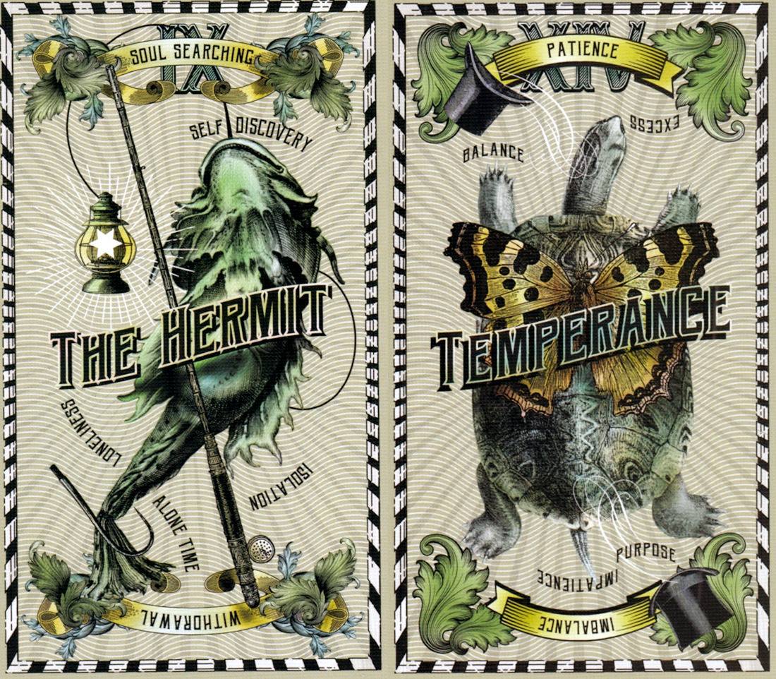 Se a Temperança for a força dominante, o que prevalece é a necessidade de conciliar opostos e assim encontrar soluções novas. Que contributo pode dar para isso o Eremita, além do mais óbvio, o de me armar com a solidez de carácter que me traz o exercício da introspecção? O Eremita rejeita o que é mundano e superficial, e tem um enfoque analítico e metódico. Estas características podem trazer à Temperança duas vantagens: primeiro, a de ajudar a seleccionar os tópicos a que estar atento, identificando e rejeitando o que não tem verdadeira importância. Em segundo lugar, a análise do Arcano Nove facilita o processo de “dissolução” da Arcano Catorze, que depois fará a “Síntese” com maior propriedade.