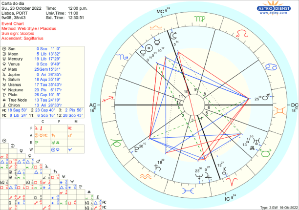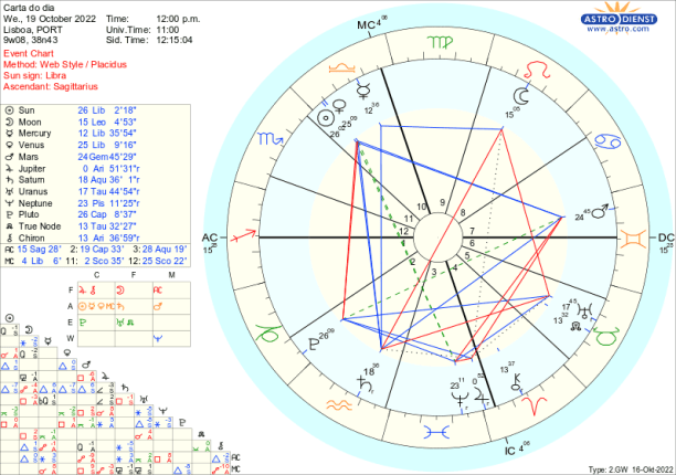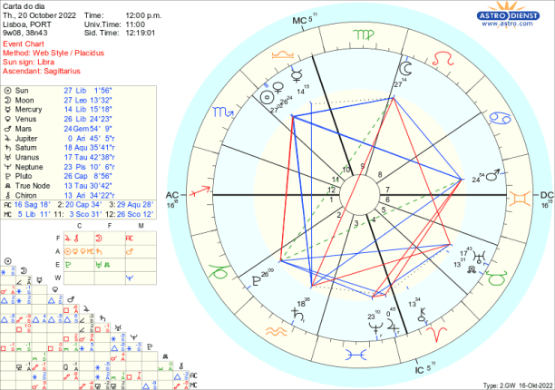 Poderíamos pensar que, por Vénus e Sol estarem a par em Balança – Vénus em seu domicilio e o Sol, por Vénus regido, – a colocarem toda a energia na busca de equilibrios, esta seria uma semana de acordos e paz. No entanto- e apesar de não faltarem esforços negociais e vontade de diálogo com Sol e Vénus em trigono a Marte em Gémeos, regido por Mercúrio também em Balança, – o facto é que uma quadratura de Plutão toda a semana e que fica exacta no dia da conjunção -também exacta – entre Sol e Venus, sábado 22, nos diz que não, não haverá sossego e que os conflitos com forças maiores são inevitáveis. O resultado será a alteração do equilíbrio de forças, uns perdem para outros poderem ganhar e as implicações tornam-se visíveis no eclipse de dia 25 em que Marte e Plutão comandam as energias do Escorpião. Aí, Sol, Lua e Vénus unem-se num novo capítulo tanto da história colectiva como pessoal, conforme a casa em que o grau 2 de Escorpião cair no nosso horóscopo. Evitar comportamentos extremos é a melhor atitude ao mesmo tempo que podemos aproveitar, pela positiva, para fazer mudanças de fundo há muito necessárias, em relacionamentos, investimentos ou parcerias. No dia do eclipse Saturno entrará directo em Aquário e isto reforça a ideia do exercício de controlo de forças maiores, restrições, limites e regras sobre o colectivo.