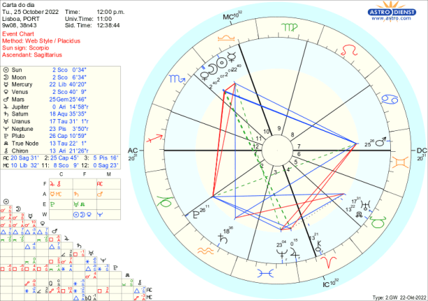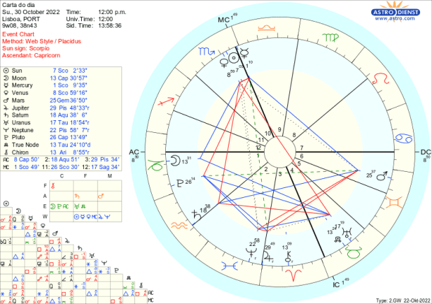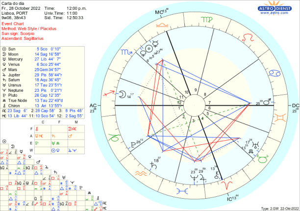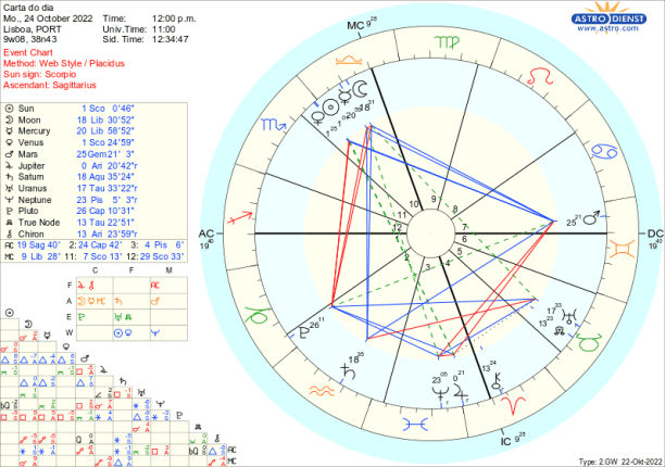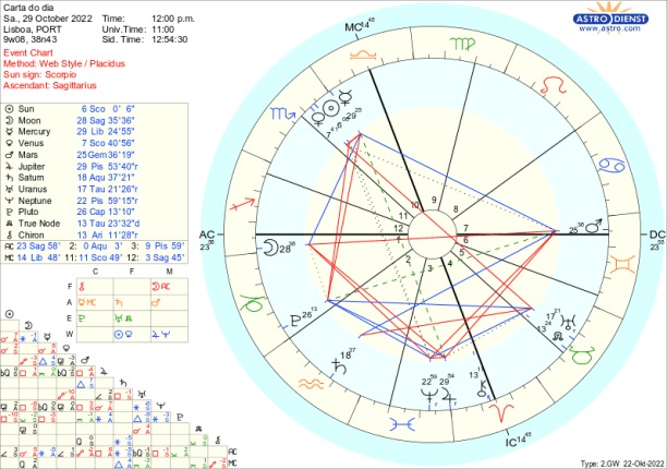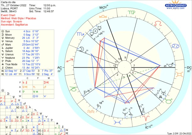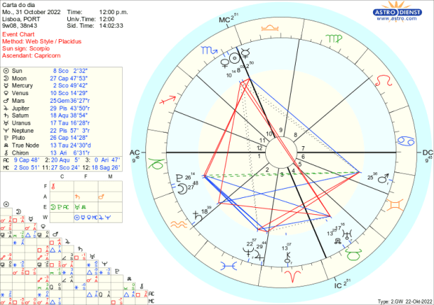 Entre o eclipse a 25 e a acalmia que a retrogradação de Marte e o re-ingresso de Júpiter em Peixes pode trazer no fim do mês, temos o trígono de Marte em Gémeos a Mercúrio que, como acima descrito, por estar quadrado a Plutão, vai forçar respostas de força. De seguida, Mercúrio junta-se ao Sol e Vénus entrando em Escorpião a 29 e os segredos também têm um papel maior no desenrolar dos acontecimentos, assim como o questionar do que está ou não nas nossas mãos fazer. Esta Lua Nova é a mais intensa do ano e o seu impacto na terça feira condicionará os eventos no resto da semana e até Janeiro quando Marte entrar novamente directo. Votos de uma boa semana… mesmo assim…
