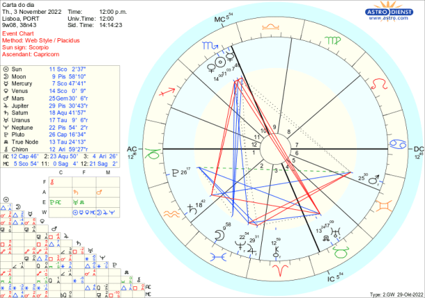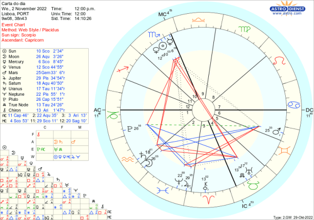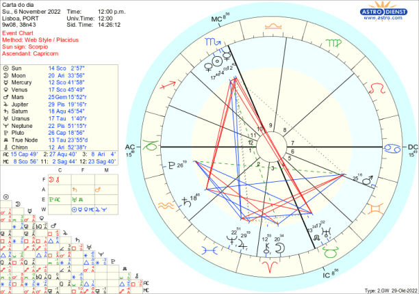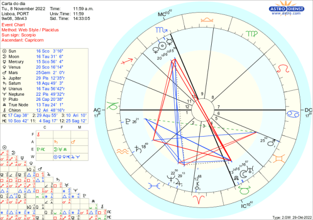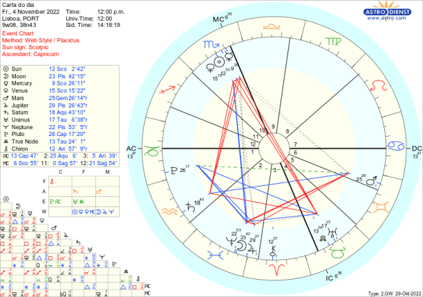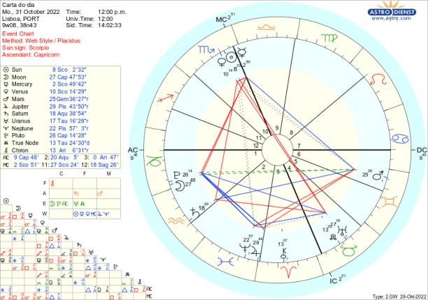 Enquanto o eclipse do Sol de dia 25 foi visível apenas na Rússia e regiões da Ásia, o de terça feira da semana que vem decorre, para além igualmente da Rússia e Ásia, sobre zonas do Norte da Europa, da América do Norte e no hemisfério sul na América do Sul e na Austrália. Em termos colectivos é nas zonas de ocultação que maior será o impacto, em termos pessoais será nas casas do horóscopo onde cai o eixo Touro/Escorpião, em particular o grau 16 do eixo, ou planetas que lhe estejam em ângulo. É Vénus e Marte, arquétipos do feminino e do masculino, da economia e das finanças, da paz e da guerra que são os focos deste eclipse porque Vénus rege o Touro e Marte o Escorpião. Para complicar, Vénus está em trânsito em Escorpião o que traz agressividade a tudo o que simboliza. Assim, daqui até lá, portanto nesta semana de 31 de Outubro até 8 de Novembro, o Sol, Mercúrio e como vimos Vénus estão em trânsito no signo do Escorpião enquanto Marte que o rege está em trânsito, retrógrado desde 31, no signo de Gémeos cujo regente Mercúrio como vimos está em Escorpião. Energias vitais, comunicação e relações estão carregadas e indissociáveis das energias marcianas. E o facto de Marte estar retrógrado não retira forças, muda apenas o foco.
