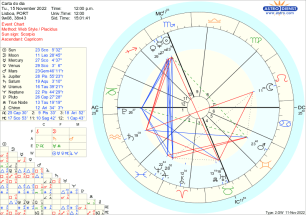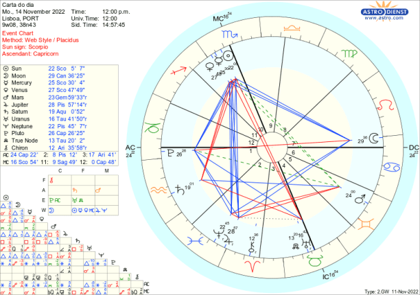 O que nos leva a essa nova fase são algumas etapas que temos de ultrapassar, esta semana. Em primeiro lugar, na segunda feira 14, um sextil de Sol, Mercúrio e Vénus em Escorpião a Plutão – sendo que o sextil do Sol a Plutão se prolonga toda a semana- acorda-nos para as possibilidades de regenerar, reformular, re-estruturar as áreas onde investimos o nosso sentido de poder, de controlo, de defesa, seja nas relações pessoais como financeiras ou políticas. Plutão está também em sextil a Júpiter e Neptuno em Peixes que por sua vez estão em trígono aos planetas em Escorpião. Resultado, aquilo que parecia impossível há um tempo atrás é agora iluminado por uma nova “ideologia”, “espírito”, sentido de universidade daquilo em que estamos empenhados. Como se tudo pudesse vir a dar certo. No entanto, há atitudes que têm de mudar ou amarras que temos de largar. Nesta segunda feira o que há a fazer é estar pronto para – em relação a casas, familia, segurança emocional – abraçar novos paradigmas, com criatividade e sentido de identidade depois de pela manhã a Lua em Caranguejo fazer oposição a Plutão e trígonos aos planetas em Água, antes de entrar em Leão,