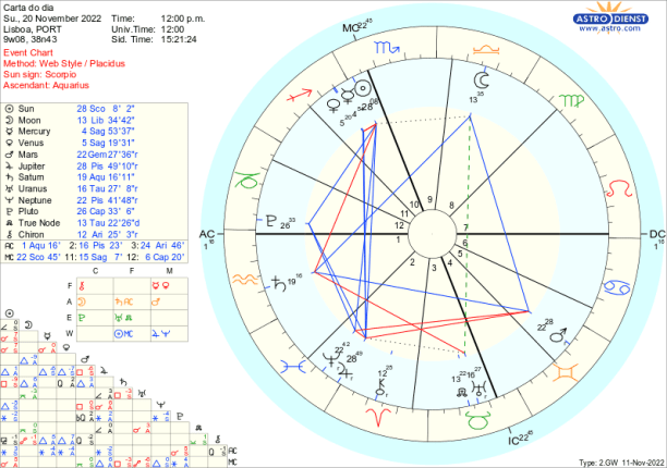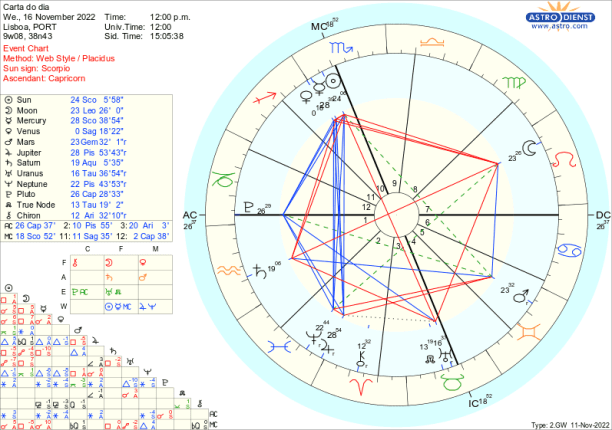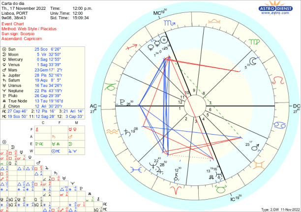 A oposição da Lua a Saturno e quadratura a Urano e ao Nódulo Norte, na terça feira, serve como chamada de atenção a correcções a fazer se o ego não tiver em conta os interesses das outras pessoas. Na quarta e na quinta Vénus e Mercúrio entram respectivamente em Sagitário e as possibilidades de abrir horizontes, físicos ou espirituais aumentam exponencialmente. Podemos querer viajar, aprender, apostar no futuro e naquilo em que acreditamos. A aventura chama mas a Lua em Virgem nesses dias e até sábado não nos deixa total liberdade de o fazer. Há que olhar aos detalhes e não embarcar cegamente nos entusiasmos. Atenção a sexta feira em que a Lua está em quadratura a Marte em Gémeos e oposta a Neptuno: as irritações ou confusões podem não ter impactos negativos.