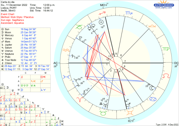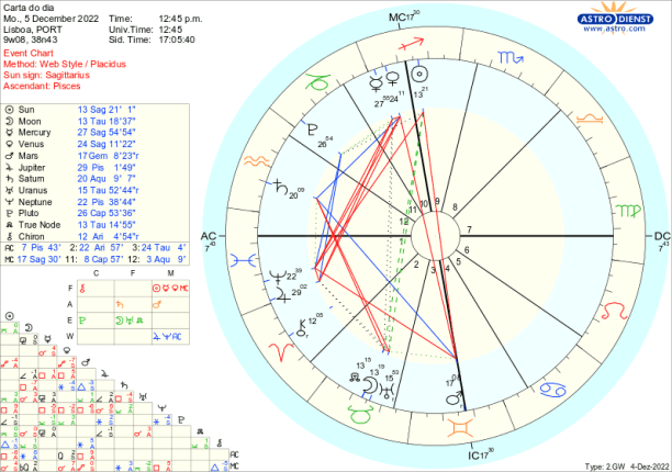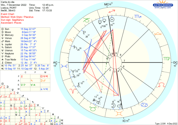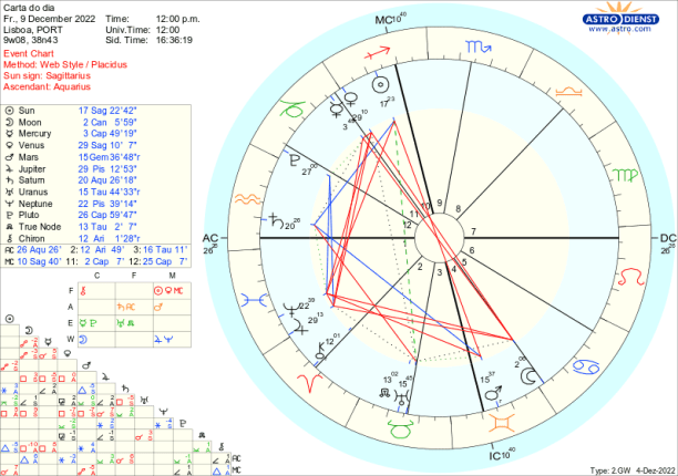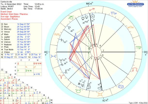 Essas emoções, que vão ser várias vezes ao longo da semana postas em causa, têm o seu primeiro choque já na segunda feira dia 8 quando o recado é de que ha que abrir mão de garantias passadas e investir em algo de novo. Isto porque a Lua está em Touro, em conjunção ao Nódulo Norte e a Urano, quadrada a Saturno e regida por Vénus que do Sagitário faz quadratura a Júpiter em Peixes tornando.nos conscientes de oportunidades de crescimento, de novos desejos e tudo com alguma dose de excitação. Ir em direcção ao novo é bom mas é preciso fechar as portas do passado. Terça feira tudo se acalma ou evolui sem esforço graças ao trígono da Lua a Plutão antes dos meio dia e a sua entrada em Gémeos pela tarde acorda-nos para as dualidades que vão chegar a extremos na Lua Cheia de quinta feira. Temos assim de terça à tarde até ao meio dia de sexta, todo um período de potencial indecisão, dúvidas ou busca de respostas enquanto a Lua transita os Gémeos. O extremar da ambivalência ocorre na quinta feira quando a Lua faz conjunção a Marte retrogrado em Gémeos, opostos ao Sol em Sagitário, com Mercúrio seu regente recém entrado em Capricórnio. Com a Lua conjunta a Marte em Gémeos, a actividade mental dispara, alimentada pelas emoções que por sua vez alimentam a busca de possibilidades ou respostas ou como descodificar a verdade que o Sol em Sagitário propõe. Disparar em todas as direcções é um risco mas o facto de Mercúrio estar em Capricórnio e de pela tarde de quinta a Lua se aproximar de um trígono a Saturno em Aquário permite pensar que vamos depois de muitas voltas à cabeça e ao coração encontrar uma saída estável, estruturada, construtiva – apesar do complicado que vai ser lá chegar…Na sexta o mais difícil vai ser não exagerar, nem em festas nem em promessas nem em sentimentos baseados em carências. A Lua em Caranguejo opõe-se a Vénus ambas em quadratura a Júpiter e a Neptuno em Peixes. Nada é para levar a sério apesar da intensidade das emoções e saber colocar limites ajuda a preparar o terreno para que no sábado, com Vénus já em Capricórnio estejam criadas as condições para levar os planos por diante. No domingo com a Lua oposta a Plutão , trígono a Júpiter e Neptuno, percebemos que não há que ter medo, os dados estão lançados e apesar de Marte ainda estar retrógrado, vamos completando as etapas passo a passo para que na última Lua Nova do ano, dia 23, em Capricórnio acabarmos 2022 já com um passo em 2023.