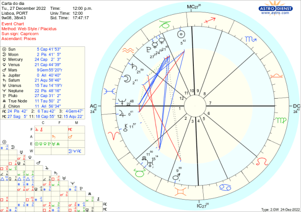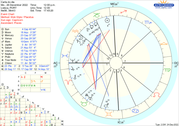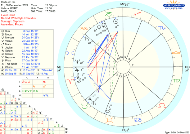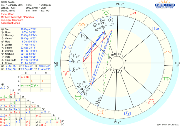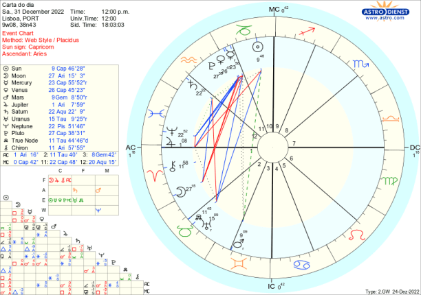 Sexta 30 e sábado 31, a Lua em Carneiro faz conjunção a Júpiter, a Quíron e quadratura aos planetas em Capricórnio. Vivemos a tensão entre o desejo de fazer e a as regras a cumprir mas primeiro um sextil e Marte e depois outro a Saturno permite dizer que conseguimos resolver os conflitos interiores e externos para entrar o ano de 2023 com o pé direito apostado na realização dos objectivos futuros com a Lua em Touro conjunta ao Nódulo Norte e a Urano a fazer trígono de seguida aos planetas em Capricórnio. Mesmo que haja foguetes os Céus pedem sobriedade com Mercúrio a entrar retrógrado depois de fazer conjunção a Vénus e como contraponto da passionalidade da quase simultânea conjunção de Vénus a Plutão. Também no dia 1 a Lua estará em quadratura a Saturno a lembrar-nos as responsabilidades a assumir em 2023. Com Mercúrio e Marte retrógrados, o ano começará lento com a necessidade de tratar do temas pendentes.