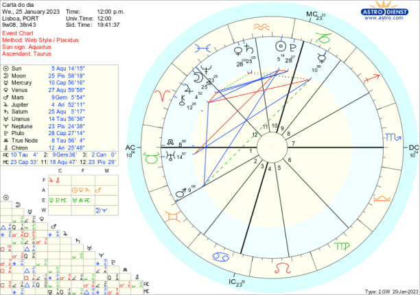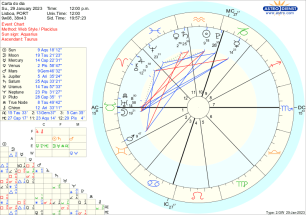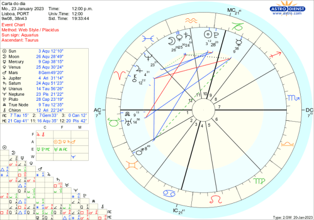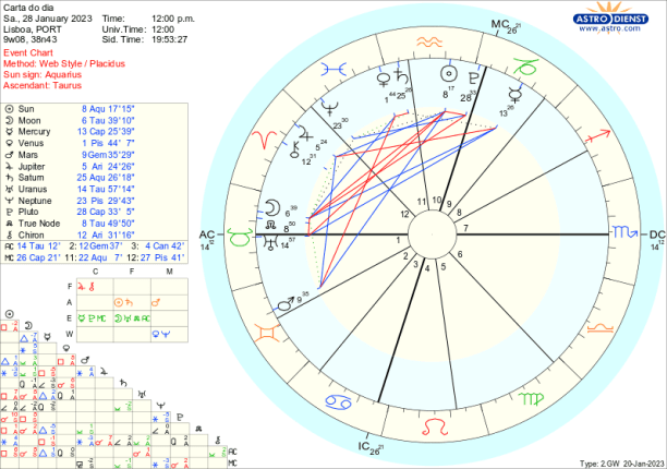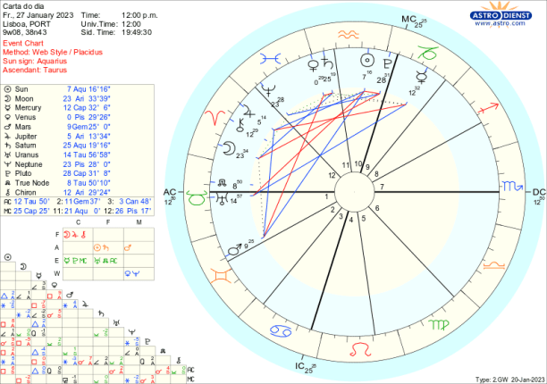 Ou seja, saímos de uma situação na conjunção do Sol a Plutão, lançámos as sementes do que está para vir na Lua Nova de Aquário de sábado dia 21 e agora estamos, com bons apoios dos Céus, a arquitectar algo de novo que, já no próximo dia 5 de Fevereiro, na Lua Cheia em Leão, dará sinais da sua criação e também das tensões ainda por resolver – dado que essa Lua Cheia vai polarizar o pessoal e o colectivo com a rebeldia consequência da quadratura dos luminares a Urano, por ocorrer nos 16 graus do eixo Aquário/Leão.
