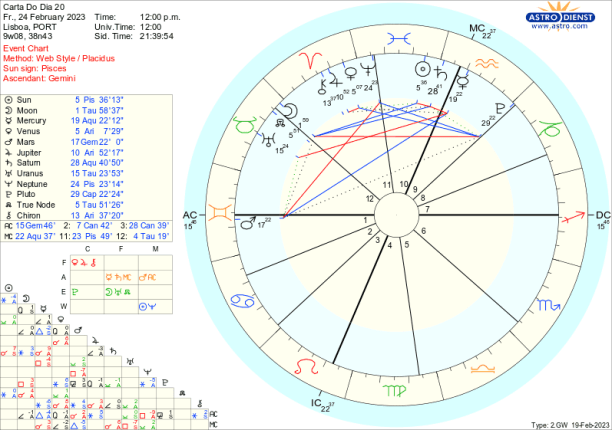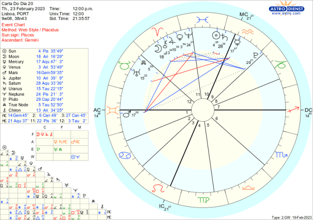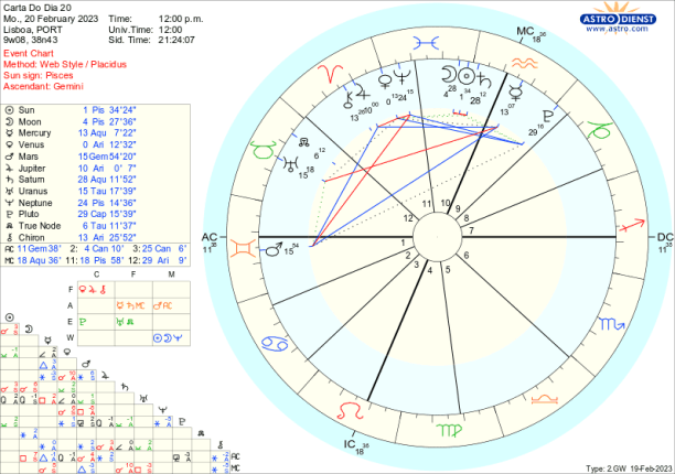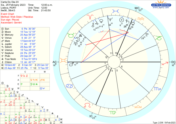 Não podia ser mais relevante o arranque da semana! E é tudo muito pessoal… e muito dependente da capacidade de exprimir o sonho, o inconsciente e o desejo de dar forma a algo melhor. Logo na manhã de segunda-feira dia 20, temos uma Lua Nova em Peixes seguido horas depois do ingresso de Vénus em Carneiro. Dia 21, terça temos a quadratura exacta entre Mercúrio e Urano e ainda Marte a aproximar-se de uma quadratura a Neptuno. Tudo isto dá o tom do que está para vir quando, ainda nesta lunação Saturno entrar em Peixes no dia 7 de Março e tocar o ponto da Lua Nova desta segunda-feira para dar estrutura ao que tivermos projectado. Faz parte deste processo a conjunção de Vénus no dia 2 a Quíron e a Júpiter que rege a Lua Nova, no mesmo dia em que Mercúrio fizer conjunção a Saturno, antes de a 12de Março Júpiter e Quíron se alinharem numa iniciativa de cura, de resolução de um ciclo de carência e de abertura de novo ciclo em que ultrapassaremos mais algumas das dores do passado. Tudo se passa até 21 de Março em que o novo ciclo lunar em cheio com o arranque da Primavera será o motor de transformação pessoal para o ano logo seguido do grande arranque do novo ciclo do colectivo com a entrada de Plutão em Aquário a 23 de Março.