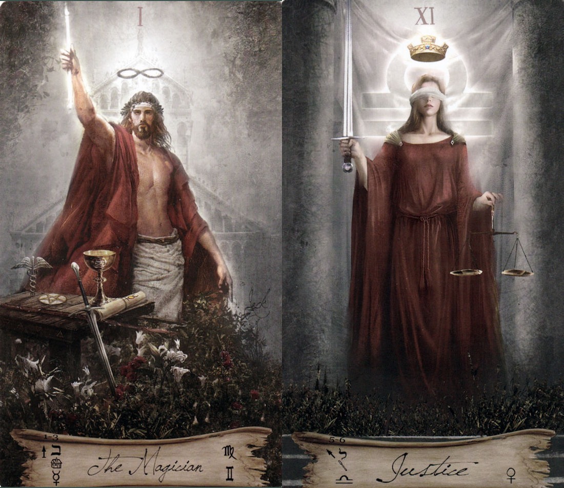 Estas duas energias, que podem ser vistas como contraditórias ou complementares, têm em comum partirem dum esforço intelectual consciente. Passa-se tudo na esfera do mental, para se traduzir na prática em acção ou atitude. Para o Mago, a acção criadora, para a Justiça uma atitude socialmente adaptativa.