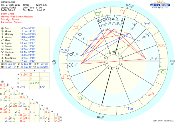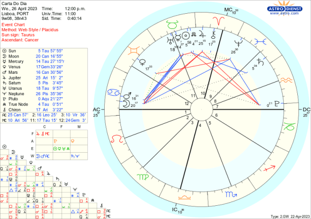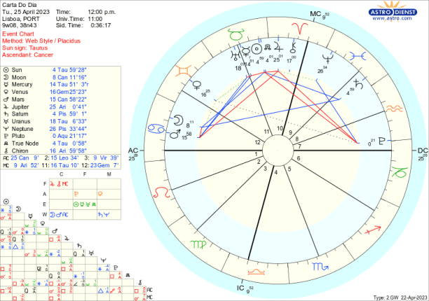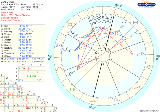 De resto, parecemos estar suspensos não só dessa re-avaliação das situações como da necessidade de não ter ilusões porque de facto sabemos que tudo está a usar radicalmente deste o eclipse de dia 20 mas não sabemos para onde vão as coisas. Plutão que estava quadrado ao eclipse está estacionário e vai ficar retrógrado no arranque de Maio e Saturno em Peixes esfria toda as fantasias. Não temos de ser calculistas mas temos de calcular bem riscos e possibilidades.