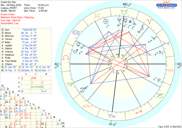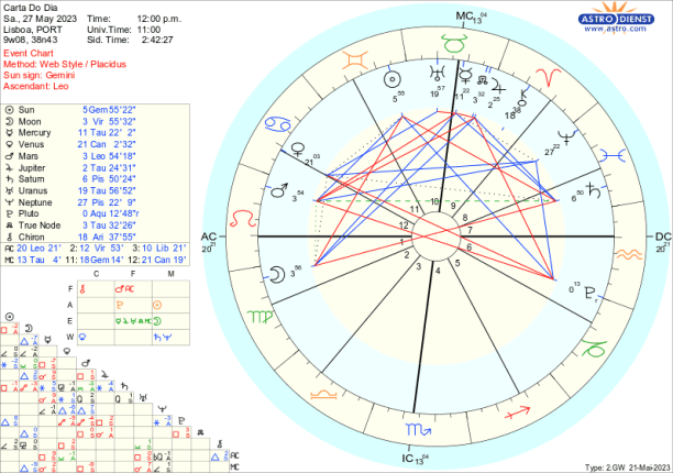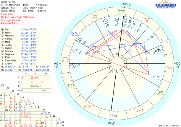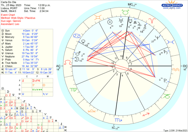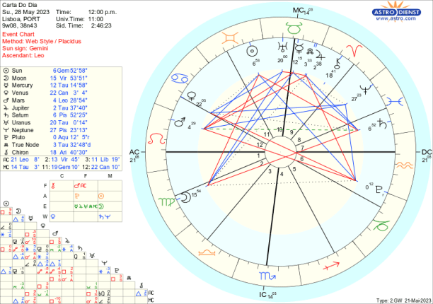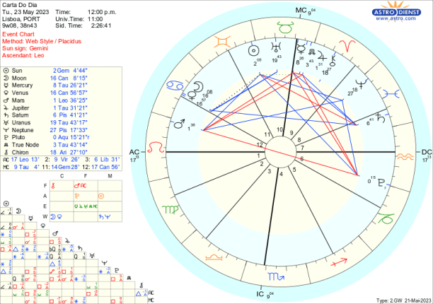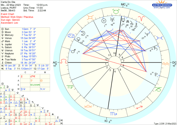 É fácil criticar ,com Marte em trânsito em Leão até meados de Julho. Regido pelo Sol, agora em Gémeos, este Marte do Leão traduz-se em egocêntricas criticas verbais, à esquerda e à direita mas não contribui para a evolução positiva dos acontecimentos antes pelo contrário tudo atiça pela oposição a Plutão e quadratura aos Nódulos e a Júpiter. É por isso necessário ter cuidado com os motivos que nos levam a acender debates, principalmente porque Marte rege o Carneiro onde está Quíron o que implica que é outro indicio de que podemos estar a intervir apenas por carências ou frustrações.