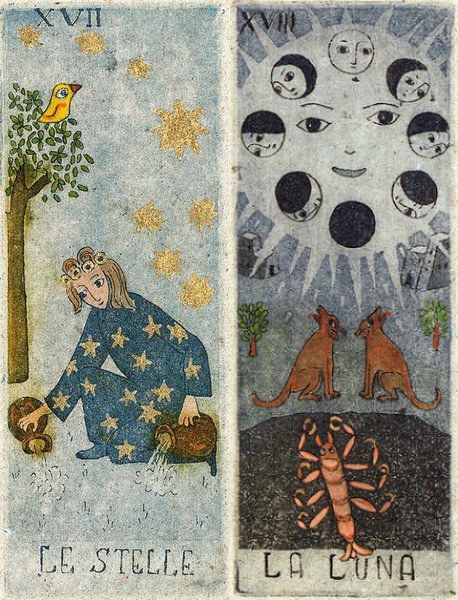 Posso ir longe, de mim para comigo ou no meu lugar, mas num plano mais universal. Lembremos que o Louco peregrino, personagem omnipresente das leituras de Tarot, percorre desta vez dois Arcanos Maiores da fase final da sua viagem, dois representantes de elementos celestes que integram uma etapa genérica superconsciente, transpessoal e transcendente. Ser capaz de trabalhar de modo positivo com estas duas cartas, Estrela e Lua, presume um nível de consciência bastante completo e elevado. Longe estamos das primeiras aprendizagens do ser, consagradas nos Arcanos do princípio da viagem. Agora, tudo me encaminha para uma percepção mais complexa, e ainda que não se leia aqui um tempo de agitação exterior ou intervenção mais virada para a prática, tenho oportunidade de me encontrar comigo num patamar mais profundo e de elevar os meus propósitos, bases essenciais para poder, numa futura intervenção, actuar de modo mais seguro e orientado.