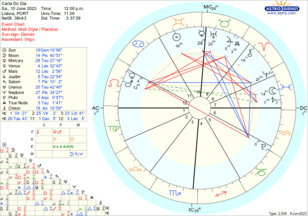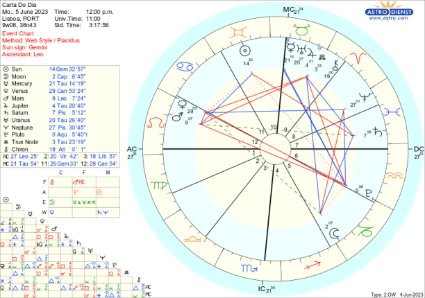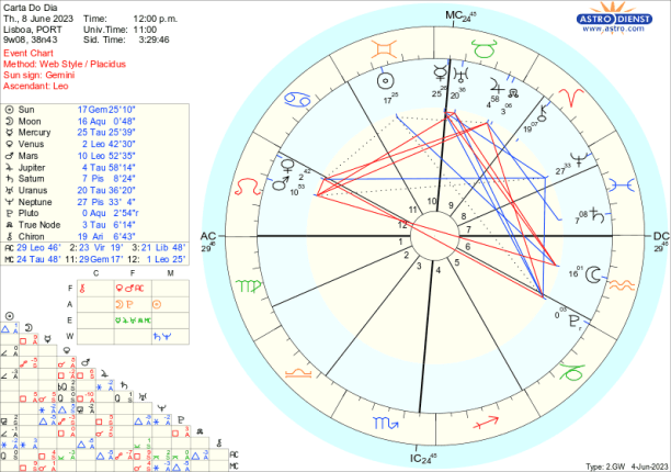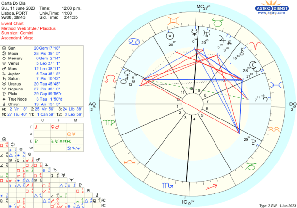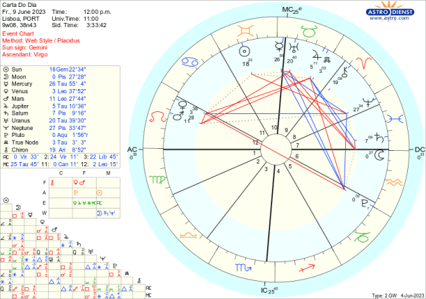 Contra esta cortina de fundo -que esta semana define o palco dos próximos meses,- temos à boca de cena, toda a semana, o Sol em Gémeos, curioso e inconstante, inteligente e elusivo em tensão com o dogmático Saturno em Peixes que exige o respeito de princípios universais e restringe fantasias. Mercurio que rege Gémeos e Júpiter que rege Peixes estão ambos em Touro, sendo que Júpiter está em conjunção ao Nódulo Norte. Ou seja, nada pode ficar no Ar nem diluído nas Águas. Tem de haver respostas concretas, práticas, palpáveis que acima de tudo não sejam repetição de velhas opções. Urano, planeta da revolução e inovação social e tecnológica, em trânsito entre Mercúrio e Júpiter é o raio de luz libertadora de antigos valores dos quais temos de nos livrar, para com isso aliviarmos o trabalho de Plutão de regresso a Capricórnio: mudam-se os valores, mudam as vontades, mudam as estruturas.