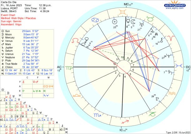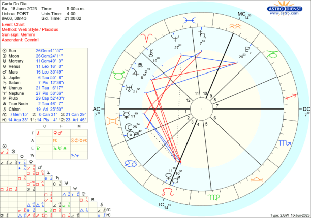 Esta retrogradação começa com um trígono a Mercúrio, regente do Sol que transita em Gémeos. Aumenta a capacidade de análise, o foco e perspectiva intelectual da agenda do que há ainda a fazer antes de podermos prosseguir caminho mas é preciso ter cuidado em não nos tornarmos obsessivos nem excessivamente desconfiados. É mais fácil perceber o que nos estava a bloquear externa e inconscientemente e a comunicação não pode ser ligeira. Este aspecto dá o tom ao longo período de retrogradação alertando-nos por isso para a necessidade de irmos ao fundo, vermos claro em toda a informação que nos é transmitida e falar claro quando nos exprimimos.