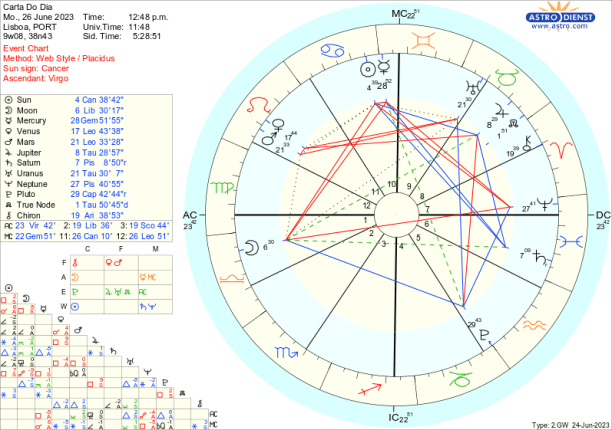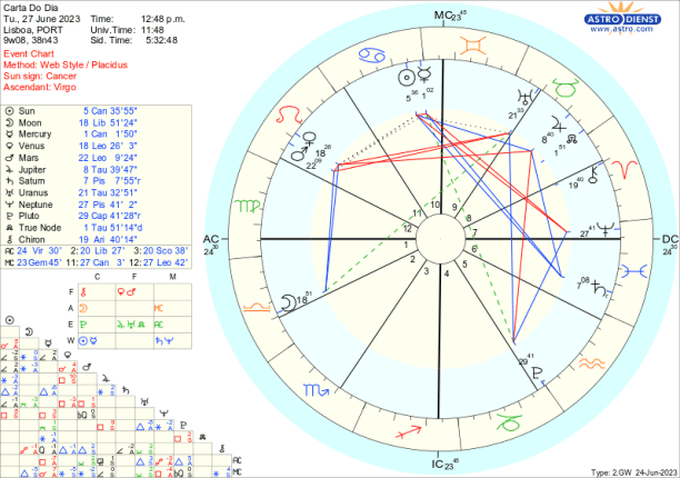 Esta semana é por isso mais um capítulo da narrativa que começou na Lua Nova no dia 18 e que sugeria uma atenção particular à informação dada ou recebida, pela sua quadratura a Neptuno. De dia 18 até agora, tivemos o equinócio e a quadratura de Marte a Urano sobre a qual, escrevi na semana passada “uma energia explosiva em que tanto os génios do bem como do mal se podem revelar… A ambição, a acção e o desejo muito ego-centrados de Marte em Leão ou o instinto básico de sobrevivência, vitória ou imposição de valores a qualquer preço, leva, na quadratura a Urano, planeta da inovação ou imprevisto, a que não haja contemplação para a energia crua que irrompe, incontrolável… ” assistimos no cenário internacional a uma ilustração desta quadratura na reviravolta do grupo Wagner e o sinal da Lua Nova persiste quando nos recomenda estar atento e tentar decifrar informações pouco claras.