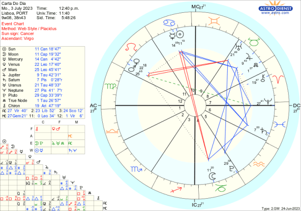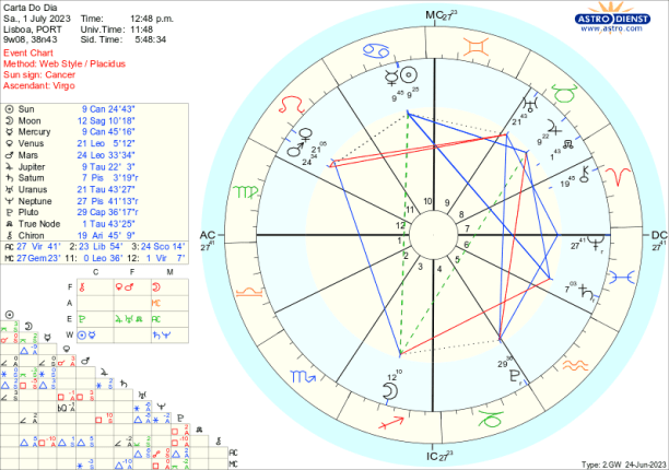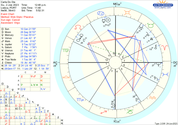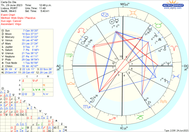 Assim, por exemplo, quarta feira, em Balança, a Lua faz uma quadratura a Plutão o que indica mais uma etapa no crescendo de transformação do que é a casa ou a nação conforme fazemos ou não acordos. . De seguida, com a Lua em Escorpião, trígono a Mercúrio e ao Sol em Caranguejo, trígono a Saturno e depois sextil a Vénus e Marte em Leão, pensamos estar na posse de algum controlo da situação ou pelo menos pensamos controlar a nossa parte da responsabilidade nesse processo em curso até à Lua Cheia de 3 de Julho. Já quinta e sexta a instabilidade , volatilidade ou meras surpresas podem reverter aquilo que pensávamos estar sob controlo, com a Lua em Escorpião em oposição a Urano, quadrada a Marte e Vénus e com um trígono a Neptuno que continua a não permitir ver claro. Mas a esperança é a última coisa a morrer e o ingresso da Lua em Sagitário pela tarde de sexta, com Júpiter seu regente em Touro em bom aspecto ao Sol e a Mercúrio, mais o trígono que a Lua faz a Marte e Vénus, ameniza a quadratura de Vénus a Urano e vemos possibilidades apesar das rupturas em curso.