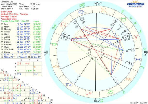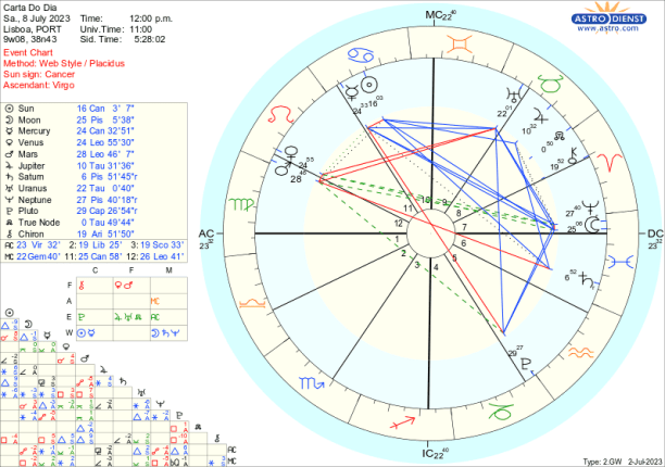 Há uma questão de fundo que é o poder que temos para mudar o que quer que seja. Marte está quincúncio a Plutão o que traz uma certa compulsividade na obtenção de resultados ou melhor, porque Marte está em Leão, na satisfação das forças do ego. Este é um aspecto de conflito que se desenrola nas próximas semanas e que se torna ainda mais significativo quando o Nódulo Norte ou sentido orientador dos acontecimentos entrar em Carneiro – que Marte rege – de 18 de Julho até 11 de Janeiro de 2025 . Com o Nódulo Norte no signo do individualismo, da guerra, tudo o que seja paz ou igualdade – Nódulo Sul em Balança – fica para trás. Às velhas alianças, sociedades, tratados, harmonia ou diplomacia sobrepõe-se o desejo próprio de vencer. O Nódulo Norte em Carneiro acompanha a transição de Plutão de Capricórnio até ao seu ingresso definitivo em Aquário e até à conjunção de Saturno e Neptuno em Carneiro, esse um novo ciclo de iniciativa controlada, também em 2025, depois de esgotadas as energias bélicas do Nódulo Norte nesse mesmo signo…