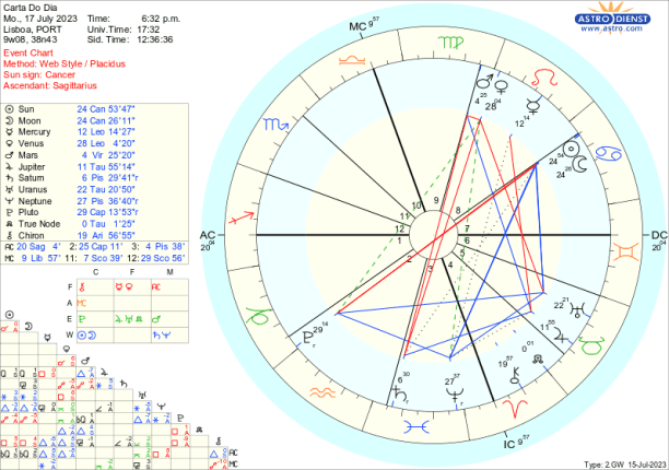 A que devemos esta agenda? Em primeiro à Lua Nova a 24 graus de Caranguejo. Uma Lua conjunta ao Sol no signo que ela rege, trígono a Neptuno em Peixes, torna-nos hiper sensíveis a tudo o que toca a nossa segurança, hábitos, raízes, amarras emocionais, casa, família, nação. Percebemos que há que lançar novas sementes, começar de novo, defender de novo, segurar de novo. Mas o modelo não pode ser mais o modelo antigo. É uma Lua Nova para uma Vida nova interior . Tecnicamente em oposição a Plutão- ao qual o Sol fará frente em grau exacto no sábado 22, esta Lua Nova confronta-nos com as pressões externas e com o que está a mudar que não é do nosso controlo e acorda-nos para nos livrarmos de dependências do passado, encontrando o bem estar que desejamos para o futuro na nossa satisfação interior.