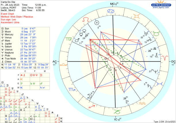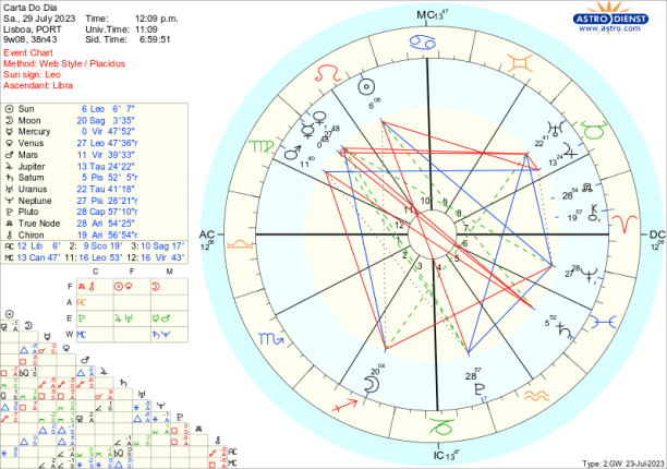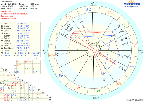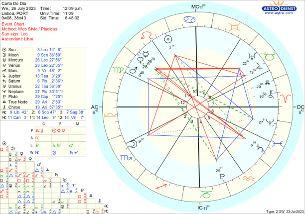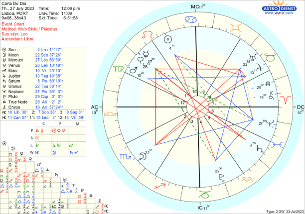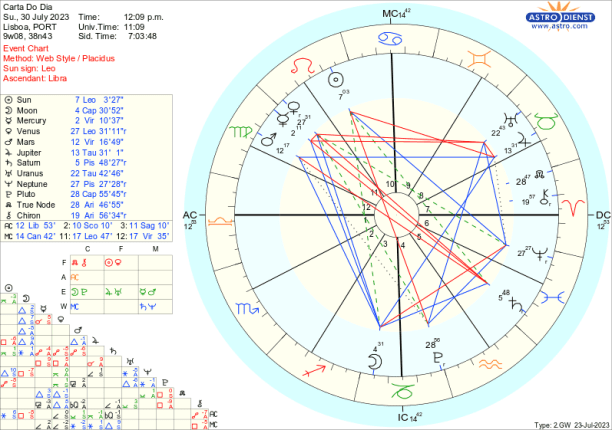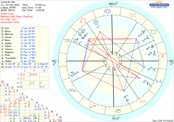 No entanto, a oposição de Plutão ao Sol no fim de semana de 24, foi bem clara no seu propósito- a velha segurança domestica, nacional acabou com o Sol nos últimos graus do Caranguejo, depois de a Lua Nova de Caranguejo ter mostrado ser o tempo de criar novas bases de governo das nossas vidas. De seguida o Sol entrou em Leão, tempo de mostrarmos as garras mas não o conseguimos ainda fazer. Reina a insegurança e a necessidade de rever amarras, preferencias, investimentos e alianças, com Vénus a entrar retrógrada em Leão, esta segunda feira dia 24, em quincúncio a Plutão. Vénus vai estar retrógrada até 5 de Setembro e volta a fazer quincúncio a Plutão a 6 de Outubro e fecha este ciclo de tensão com Plutão na segunda quinzena de Fevereiro do ano que vem em que Venus e Marte fazem conjunção a Plutão nos 0 graus de Aquário. Ou seja, com oscilações temos pela frente seis meses e meio para preparar um novo ciclo de relações, alianças, investimentos e afirmação colectiva. Não há que ter pressa, há que reflectir e cuidar cada passo em direcção a um futuro diferente. Controlar a compulsividade, as chamadas de atenção, o receio de traição é dar espaço a uma nova maturidade na escolha do que vale a pena perseguir, defender, alcançar, com o Nódulo Norte em Carneiro oposto ao Sul em Balança que Vénus. Esta necessidade de novos valores é coadjuvada pelo trígono a Plutão de Urano em Touro- regido por Vénus que mostrará os seus resultados quando estiverem em trígono exacto de Gémeos para Aquário no Outono de 2025. Entender este percurso ajuda a perceber o papel fundamental da comunicação e dos meios tecnológicos – incluido a inteligência artificial – como veiculo de resolução de todas as crises.