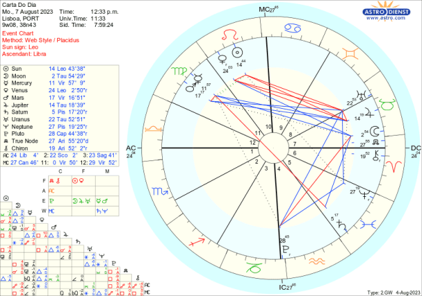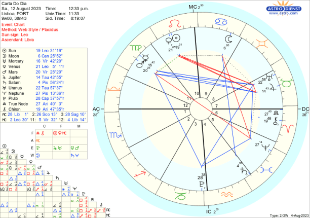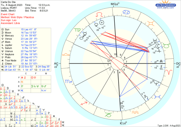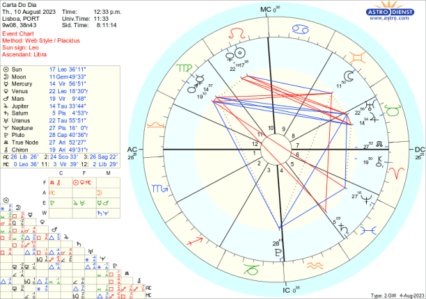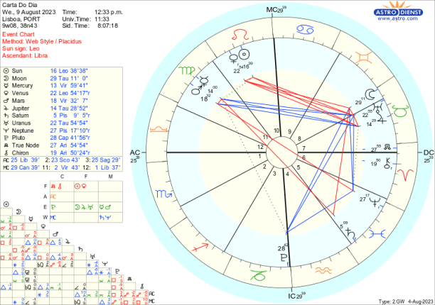 Para a semana, na quarta feira dia 16 de Agosto, um novo ciclo lunar – no grau em que Venus entrou retrógrada – e em quadratura a Urano, diz-nos muito sobre as energias que vamos ter de usar para entrar no próximo capítulo. Ou seja, na quarta 16, Sol e Lua encontram-se a 23 graus de Leão, em aspecto tenso a Urano em Touro, enquanto Marte faz um trígono a Urano e Vénus um trígono a Quíron em Carneiro. Tudo isto nos segure, para a Lua Nova de 16, acção decisiva, detalhada e inovadora, no sentido de romper com o que esta semana ainda não conseguirmos resolver.