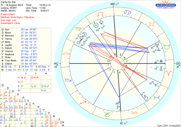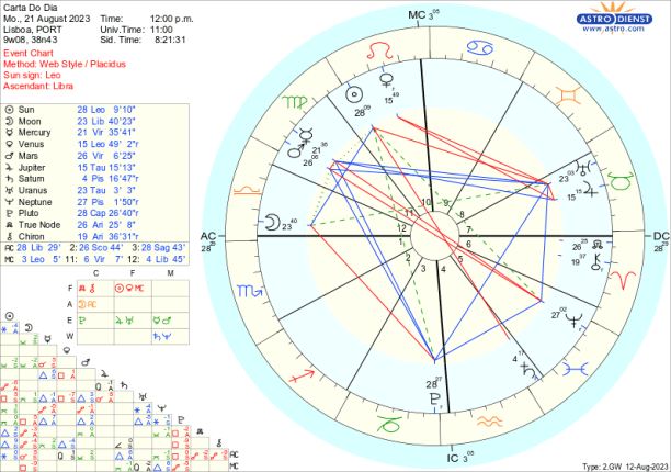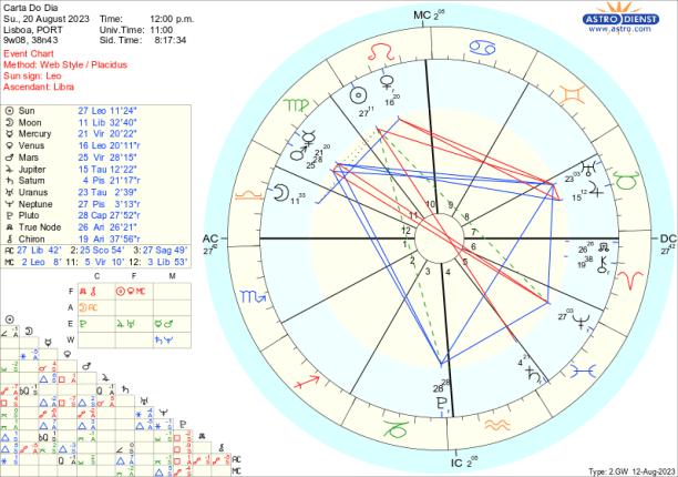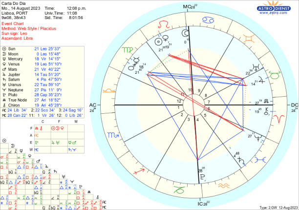A dar Fogo ao Papagaio está a Lua Nova em Leão, numa relação de grande tensão com quadratura a Urano e Júpiter, em semi-quadratura a Mercúrio e Marte, em órbita de quincúncio a Plutão e Neptuno., todos aspectos difíceis ou de impacto difícil. O planeta estabilizador que seria Saturno está fora de todas estas equações, apenas em quintal a Júpiter, sinal de que se quer mudar as coisas usando os seus próprios meios.