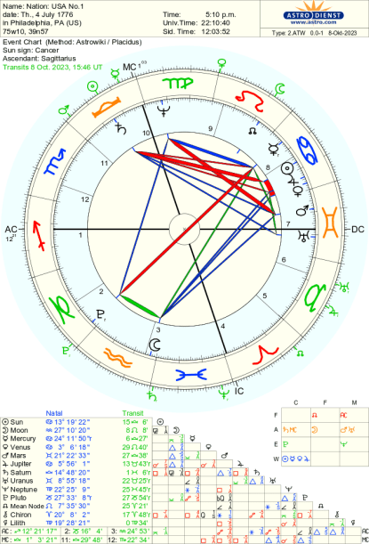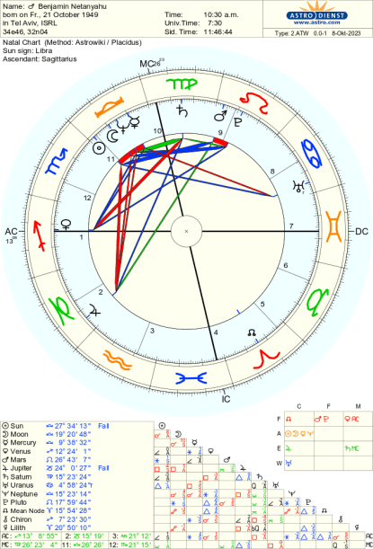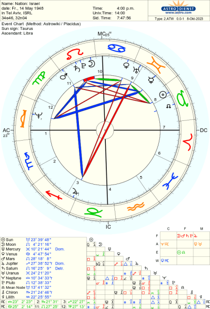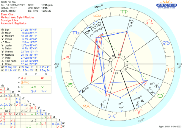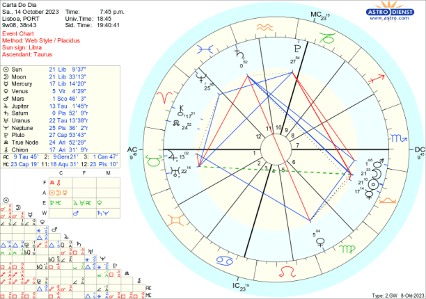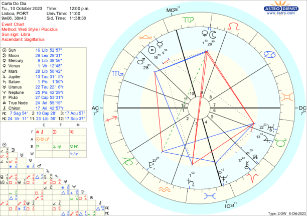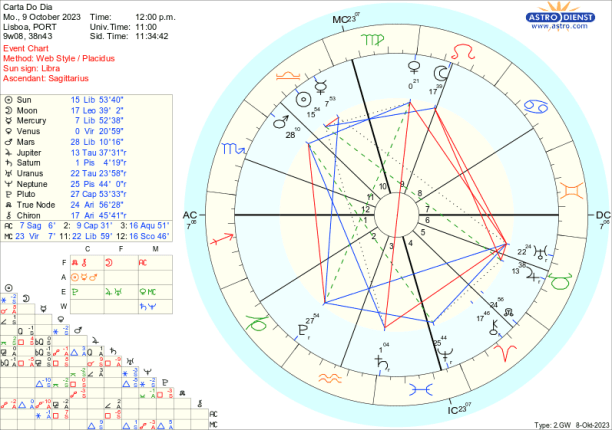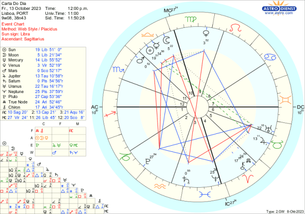 É na segunda feira dia 9 que Marte está em quadratura exacta a Plutão depois de ter feito conjunção ao Nódulo Sul em Balança durante o fim-de-semana tempo em que obrigou tantos países a definirem posições e acabar com qualquer paz podre face ao ataque brutal do Hamas a Israel. Dia 10 é Plutão que entra directo e dia 11 o Sol em Balança opõe-se a Quiron em Carneiro iluminando a impossibilidade de acordos. Dia 12 Marte entra em escorpião, está em casa, no signo que rege e o seu uso da força segue a ideologia pelo trígono a Saturno em Peixes na sexta feira 13. Segue-se no sábado o eclipse do Sol e Lua Nova como já vimos a marcar um novo capítulo nesta narrativa de mudanças fortes ou pela força em que velhas feridas de liberdade de acção ou impulso bélico vêm a tona pelos aspectos sucessivos a Quiron em Carneiro. Para a semana seguir-se-ão os desenvolvimentos do que o eclipse do Sol e a Lua Nova semear em termos de fins de alianças e definição de novas parcerias que Marte em Escorpião não hesitará em afirmar. Claro que tudo tem impactos financeiros e é provável que seja por volta do eclipse de 28, o último do eixo Escorpião/Touro- finanças versus economia, intensidade emocional versus pés na Terra, -que mais claras sejam as consequências…
