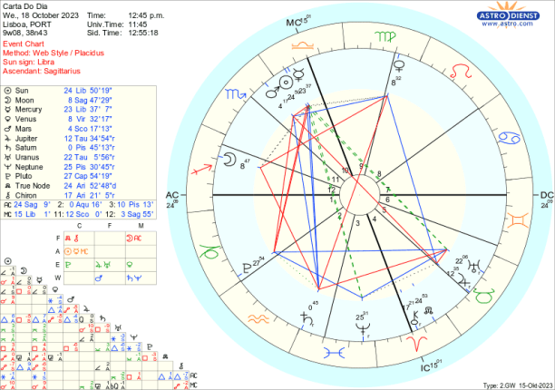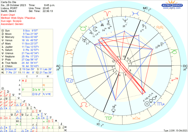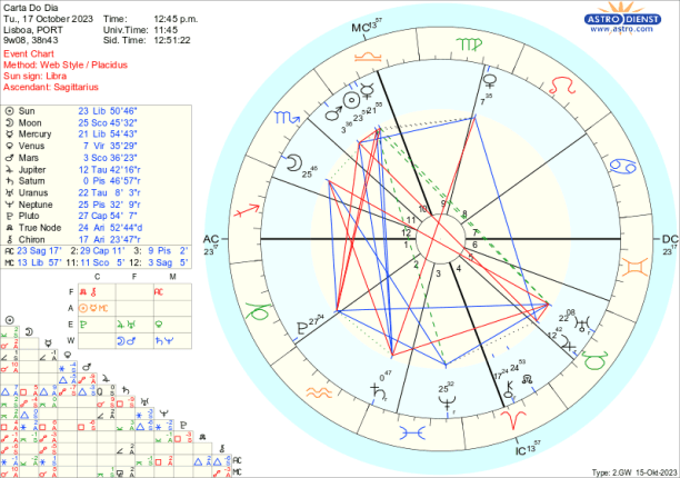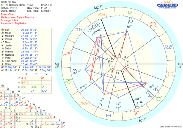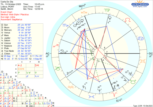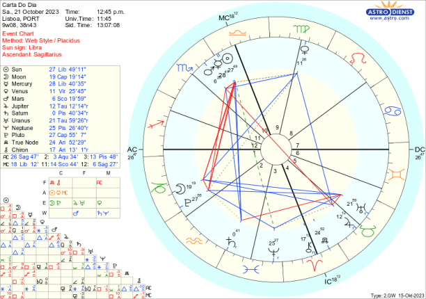 Esse quadro geral tem por pano de fundo, em primeiro lugar, as activações de poder/guerra/transformação na ordem estabelecida por Plutão em Capricórnio, alimentado pelas ideologias, fé ou fantasias do sextil a Neptuno em Peixes. Plutão só entra definitivamente em Aquário no final de 2024 por isso daqui até lá as estruturas pessoais, colectivas e políticas caducas têm os dias contados, a bem ou a mal. De seguida, o cenário inclui também até meados de 2025 o transito de Saturno em Peixes que fará conjunção a Neptuno ao entrar em Carneiro em Maio de 2025. Estes ciclos de Saturno/Neptuno estão sempre, desde o século XIX e sem falha, associados a mudanças de regime na Rússia e simbolizam nova organização ideologia. Aplicar-se há na Rússia, talvez noutras regiões do globo mas a titulo pessoal simboliza processos de desilusão que obrigam à adopção de novas estruturas de vida, estabelecimento de novas fronteiras físicas e psíquicas e uma nova ordem emocional- e regras para os oceanos. E ainda no quadro geral temos Urano em Touro também até 2025 a excitar revoluções de valores, dinheiro virtual, tecnologia aplicada até as coisas mais básicas. No próximo eclipse total do Sol resposta ao de 14 de Outubro e que terá lugar em Abril de 2024, Júpiter e Urano estarão conjuntos e algum salto tecnológico, alguma reviravolta gigante de valores nos surpreenderá certamente. Sempre, sempre, até 2025 também com o Nódulo Norte a apontar a via do Carneiro deixando para trás a Balança. É Marte que simboliza agora o caminho, o futuro e se sobrepõe a Vénus, a paz passada…