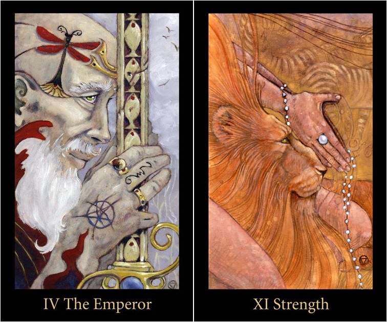 Astrologicamente, o Imperador corresponde ao signo de Carneiro e a Força ao de Leão. Fogo com fogo – um grande “incêndio”. Ora, se com o fogo se reforça o fogo, também com o fogo se combate o mesmo… O quatro, da estabilidade e do quadrado, vem aqui a par do onze, número mestre do altruísmo e da compaixão. Dará algum trabalho conseguir que as energias de ambos se complementem, mas, se o conseguirmos, o resultado pode ser francamente construtivo.