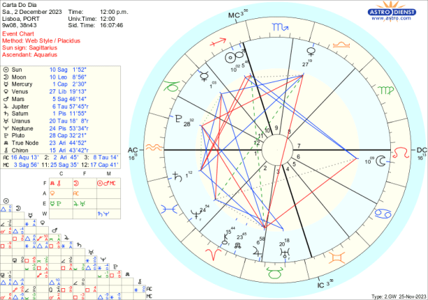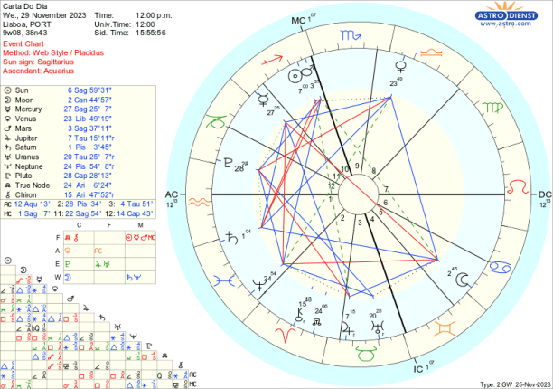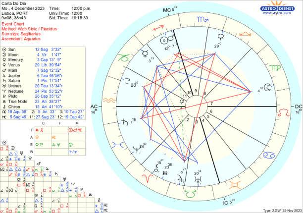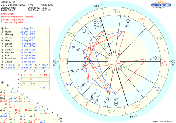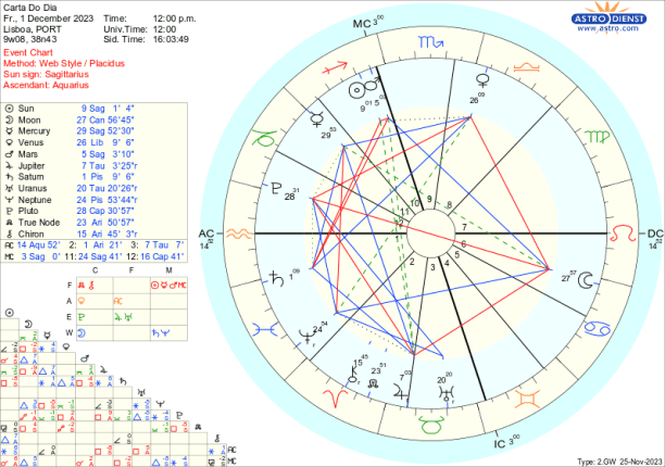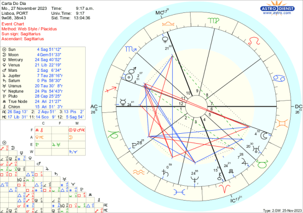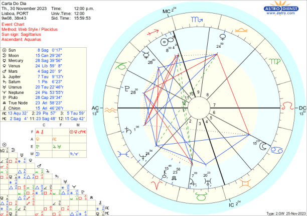 Estamos a sair de um mês ultra intenso, carregado de eclipses e energias radicais que alteraram o status- quo individual e colectivo mas ainda há muito que resolver. Para resolver é preciso uma regeneração das relações pessoais/ políticas/ financeiras e o tempo para isso só começa a 5 de Dezembro quando Vénus entrar em Escorpião, depois de fazer quadratura a Plutão nos dias 3 e 4 de Dezembro. Ou seja, desta Lua Cheia até aos primeiros dias de Dezembro, podemos tentar equilibrar as situações com um diálogo que foque mais nas ideias do que na prática já que Vénus faz sextil a Mercúrio em Sagitário. No entanto, uma abordagem mais realista, sóbria e a pensar no longo prazo impõe-se a partir do dia 1 de Dezembro, a próxima sexta, com a passagem de Mercúrio do Sagitário para o Capricórnio, em sextil a Saturno. A comunicação estruturada que Mercúrio em Capricórnio permite, facilita lidarmos com as separações nas relações de qualquer tipo que naturalmente ocorrem com a quadratura de Vénus a Plutão. Isto dura de 1 a 5 de Dezembro, tempo em que não só a dois ou na política mas também nos comportamentos financeiros urge não ir atrás de respostas compulsivas ou querer segurar o insegurável..