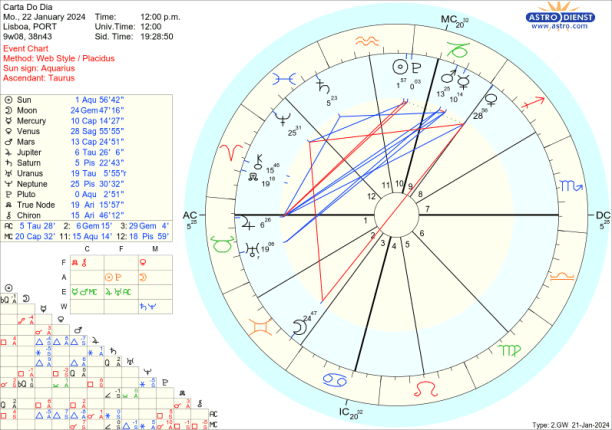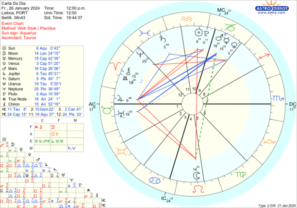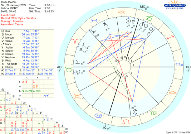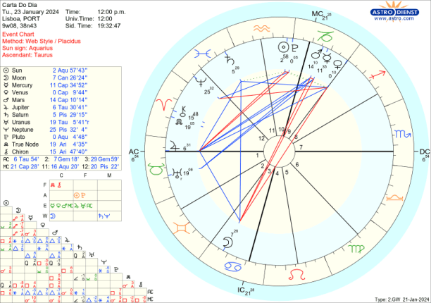 Toda a semana, Saturno, primeiro regente do Aquário, em trânsito em Peixes, faz sextil a Venus e a Júpiter como se o desejo ou ambição de ordem e estrutura – que Vénus em Capricórnio preconiza- ajudasse Saturno em Peixes a dar forma aos ideais e ideologias e isso permitisse a Júpiter em Touro conquistar mais terreno, materializar mas ganhos…Um resumo pode ser ir à luta pela velha segurança..Em simultâneo, Urano, o segundo regente de Aquário, também em trânsito em Touro, pede o contrário… pede novos valores, inovação, descobertas com aplicação prática que alimentem a conjunção de Mercúrio e Marte em Capricórnio, a que faz trígono durante também toda a semana. Nitidamente dois polos, duas visões acentuados pela quadratura de Marte e Mercúrio ao Nódulo Norte e a Quiron quase conjuntos em Carneiro que Marte rege. Difícil, tenso, implica guerra e conquista de poder…Está a ocorrer em muitos muitos pontos do globo e envolve cada vez energias com o Sol e Plutão no signo do colectivo…