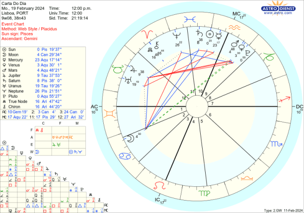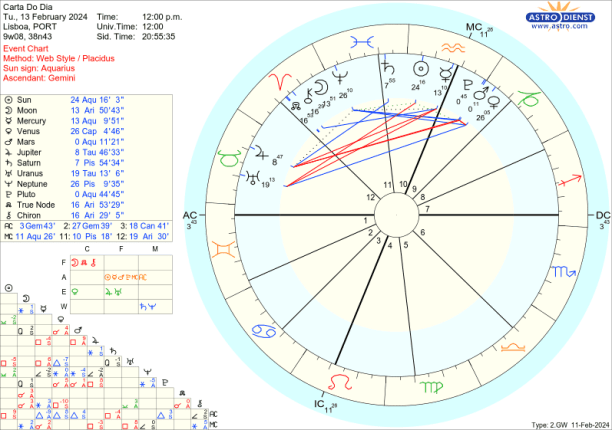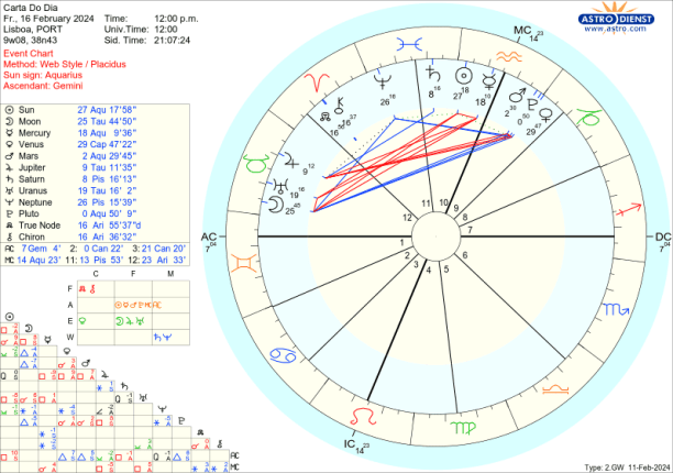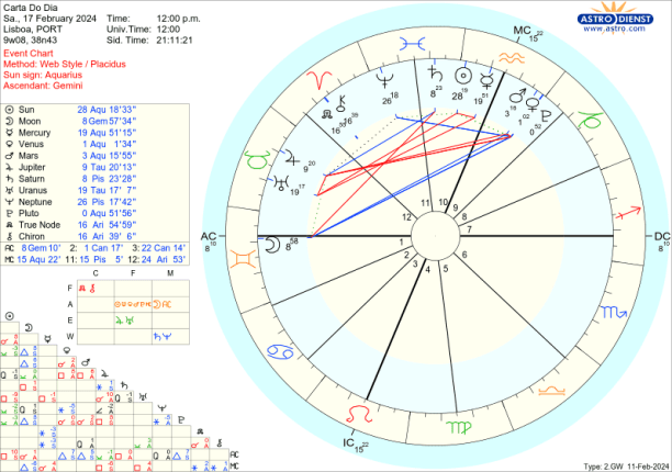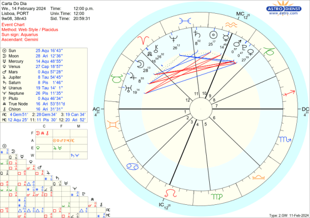 Esta é a semana dos Namorados e o dia de São Valentim promete ser intenso… com mais querer e poder do que receptividade e harmonia…. Se o que estiver em causa não for o amor mas sim levarmos por diante projectos de envergadura e impacto social, então esta é a semana para um arranque potente e transformador das condições. De facto, desde Janeiro Marte exaltado em Capricórnio tem vindo a permitir tomarmos os assuntos em mão, quebrar a ordem existente, ser proactivos na persecução de objectivos. No mundo isto tem-se traduzido em conquistas territoriais nas guerras em curso, em ataques as instituições e à corrida pelo sucesso em todas as frentes. Isto, de uma forma mais evidente e brutal do que o costume, alimentando assim o desígnio da conjunção do Nódulo Norte a Quíron em Carneiro – que Marte rege: é tempo de acção, acção que cure feridas de inaptidão, acção que mova montanhas com toda a força da ambição de vencer.