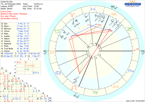 O Sol em Peixes em conjunção a Saturno, a partir de 19 e até dia 3 de Março – exacto a 28 e 29 de Fevereiro, pede responsabilidade, disciplina, perseverança, paciência para ganharmos maturidade, pese o que pesar. A casa onde tivermos o primeiro decanato de Peixes é onde este exercício de encaixe da realidade se vai manifestar. Regido tradicionalmente por Júpiter e na astrologia moderna por Neptuno, este decanato não deixe de ser, qualquer que seja a regência considerada, uma área em que a teimosia faz dos fracos fortes e em que a sedução ou ingenuidade muito ajuda a nas dificuldades. Assim, esta semana é importante, com sentido prático dar forma aos sonhos, ver como podemos concretizar responsabilidades humanistas ou criativas sem deixar que as ideologias ensombrem a critica ou o positivismo que podemos encontrar na realidade.