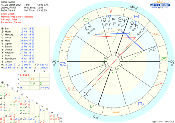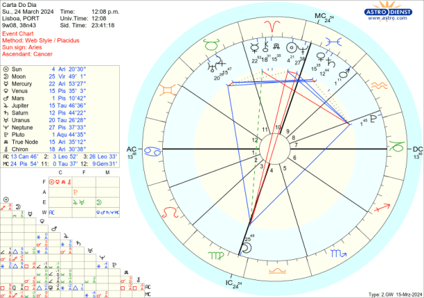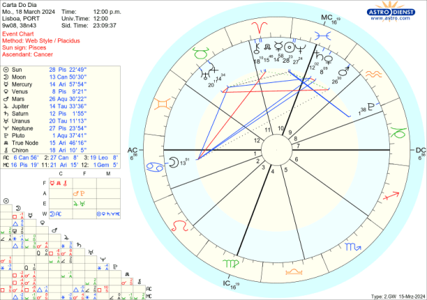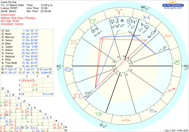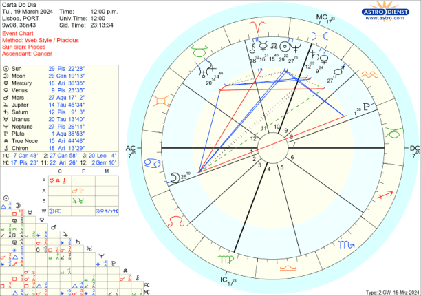 Até quarta feira o Sol está ainda em Peixes conjunto a Neptuno alimentanda assim a dissolução lançada no dia 10 com a Lua Nova neste signo. Dia 20 o ingresso do Sol em Carneiro ocorre em trígono a uma Lua em Leao e sextil a Plutão em Aquário o que nos diz que é um dia forte para iniciativas que potenciem transformações colectivas/socias e que algum dramatismo ou desejo de reconhecimento está envolvido assim como a necessidade de criatividade para definir novos caminhos. Sol e Lua estão em Fogo o que pede convicção mas Vénus, Saturno e Neptuno estão para trás, ainda em Peixes. Marte, nos últimos graus de Aquário tem ainda de passar pela dissolução dos Peixes antes da sua acção ser efectiva.