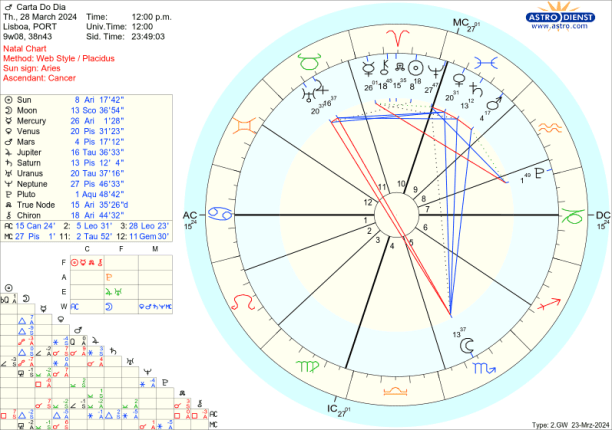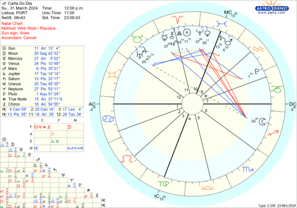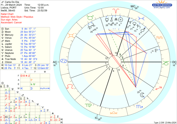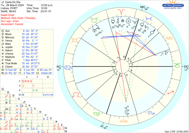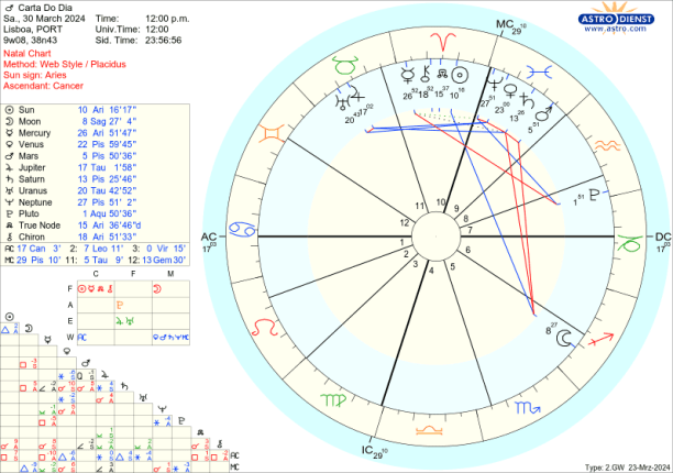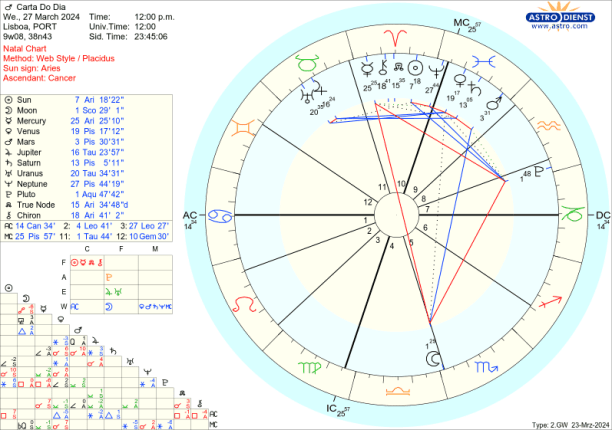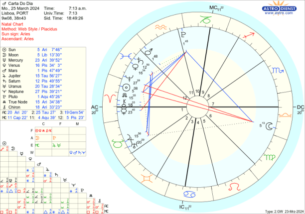 Uma primeira indicação pode vir de Plutão em sextil ao Sol em Carneiro e em trígono à Lua em Balança. Isto diz-nos que o nosso desejo de harmonia face força de vontade do ego, meu ou dos outros, tem de se manifestar numa transformação do modo como nos organizamos dentro das relações, com o par, como grupo, em sociedade, politicamente. Vénus que rege a Lua eclipsada está exaltada em Peixes em sextil a Júpiter e Urano em Touro. Podia ser sinal de uma enorme potencial generosidade na abordagem dos problemas mas Vénus está conjunta a Saturno e por isso há limites a impôr ou que nos são impostos. Definir fronteiras não é para mantermos os outros de fora mas sim para reconhecermos e respeitarmos os nossos próprios limites. Ou seja, não podemos não deixar de ter cabeça fria mesmo quando o mais importante parece ser por termo a conflitos. Marte que rege o Sol em Carneiro acaba de entrar em Peixes sugere que, mais do que acção directa, usemos a imaginação, intuição ou orientação espiritual para encontrar soluções alternativas às crises que enfrentamos nas nossas relações pessoais, financeiras ou políticas.