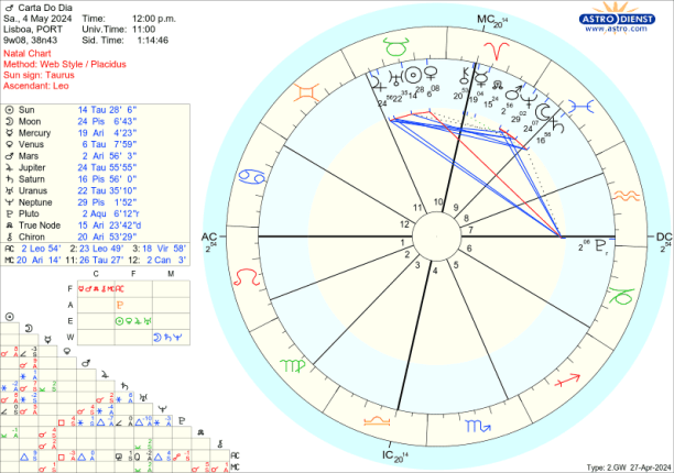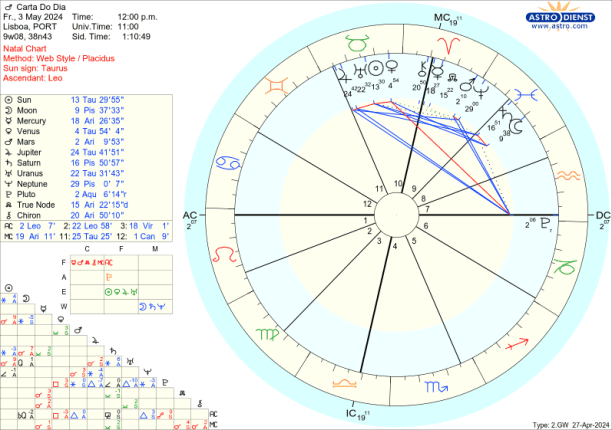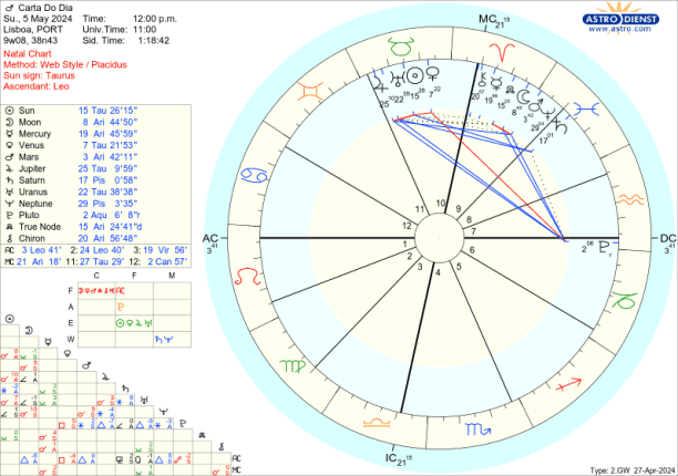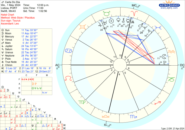 Vénus sai de Carneiro e entra em Touro, do Fogo para a Terra, vai do impulso para a materialização, mas com um estrondo pelo aspecto que faz a Plutão. Marte sai de Peixes e entra em Carneiro, da Água para o Fogo, do inconsciente colectivo ou ideologias para a determinação, combate. Estão ambos nos signos de que são regentes, estão em casa, à vontade. Vamos sentir essas energias no nosso mapa, onde tivermos os primeiros graus de Touro e Carneiro e vamos também, a nível global, sentir o impacto dessas mudanças em particular a 30 de Abril e 1 de Maio.
