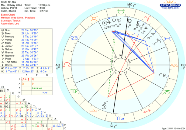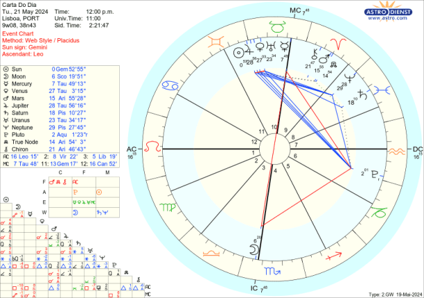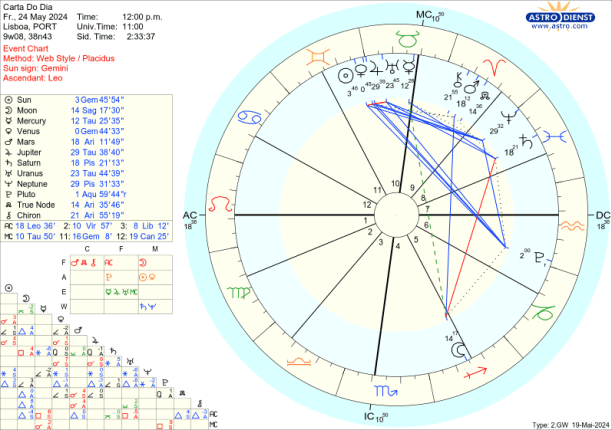 No dia seguinte, sexta feira, Júpiter entra em Gémeos e então os ventos de mundança sopram com força. Até Junho de 2025 o trânsito de Júpiter em Gémeos permite uma nova visão, conceito, sobre todas as áreas da comunicação, dos transportes aos media, da informação ao comércio e um incremento de viagens curtas, turismo etc. Júpiter está em queda em Gémeos porque rege o signo que se lhe opõe, o Sagitário, por isso temos mais trabalho a distinguir o verdadeiro falso e a fazer a síntese dos dados mas é isso que Júpiter pede, abrindo o caminho das redes de comunicação para que o ingresso de Urano em Gémeos em Julho de 2025, também em trígono a Plutão em Aquário, instale globalmente a nova era de inteligência artificial e mais, que a todos permitirá, no mínimo, novas formas de comunicação e certamente a circulação do dinheiro virtual depois do fim da sua passagem em Touro.