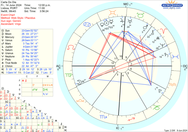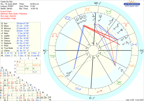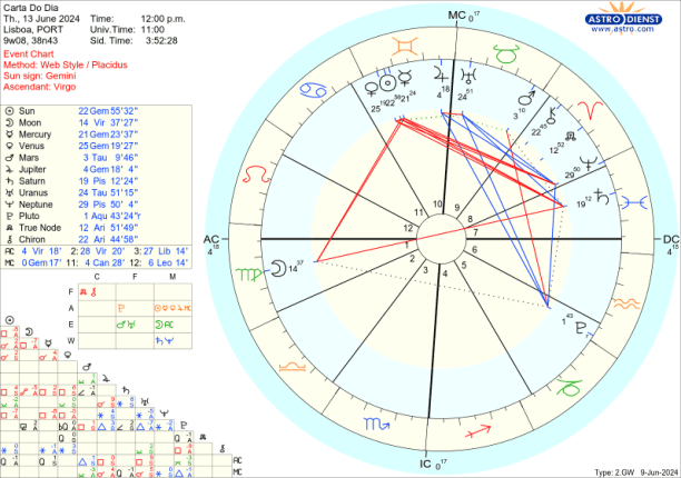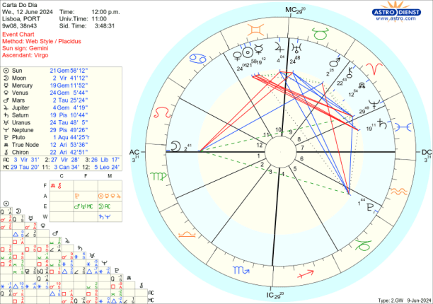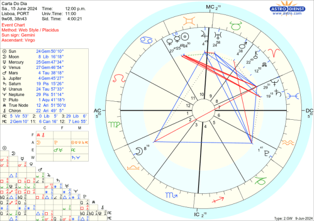 Aspecto a aspecto os cenários são os seguintes – tendo como pano de fundo a)Plutão retrógrado em Aquário na revisão de todas as transformações políticas, sociais, grupais que têm vindo a acontecer desde Janeiro; b) Saturno estacionáro em Peixes a receber até ao final da semana uma quadratura do Sol o que bloqueia, dificulta, atrasa os processos de comunicação, viagem, contas etc; c)Neptuno a receber uma quadratura crescente, exacta nas vésperas do solstício, de Vénus, Mercúrio e Sol, que tinge de ideologia, fantasia, confusão as relações e como as exprimimos: