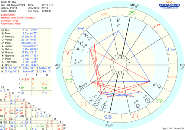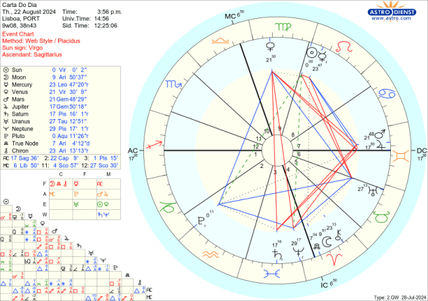 No dia 22 o Sol entra em Virgem e o foco deixa de estar no brilho pessoal, ego ou criatividade nos focarmos no serviço, nas contas, nos detalhes que ainda estamos a rever com Mercúrio retrógrado. No entanto, a Lua conjunta nesse dia a Quíron em Carneiro, depois de fazer também conjunção ao Nódulo Norte traz-nos a inquietação quanto ao que podemos ou não fazer. A impaciência e a agressividade devem ser controladas porque com Marte, regente da Lua em Carneiro, quadrado a Saturno e quadrado a Vénus é preciso não perder a cabeça com rejeições e tentar chegar desde já a compromissos.