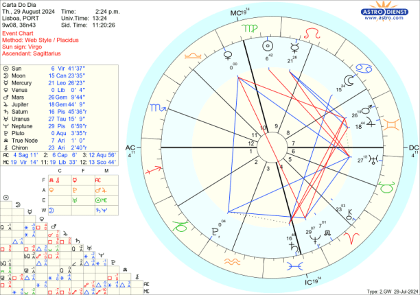 Vamos desenvolvendo esse projecto pessoal, amoroso, criativo lançado dia 4 sempre na base da revisão da matéria e das posturas e das condições e princípios até à Lua Cheia, dia 19 em que o Sol está no decanato regido por Marte e a Lua no decanato regido por Vénus. Temos agora a vitalidade oposta às emoções, desejos contraditórios e a tensão da aceitação pelo grupo, como se o eu e os outros fossem polos distintos onde não há espaço para os requisitos do nosso sentido de identidade. As sementes da Lua Nova levam-nos a algum desespero e descontentamento na Lua Cheia porque para além das caracteristicas da oposição tudo se complica no dia 19 com Saturno oposto à Vénus- tensão financeira e amorosa e Urano em Touro quadrado em quadratura tanto ao Sol como à Lua – e a Mercúrio que pós cazimi ainda está conjunto ao Sol -a trazer surpresas, inesperados, valores novos que forçam mais radicalmente a resolução das tensões já existentes. É certamente um dia complexo, irritante, impossível de planear com segurança e em que a flexibilidade e abertura é a melhor atitude. É também nesta Lua Cheia que se realiza a Convenção Democrática nos EUA e a quadratura de Urano à Lua Cheia será certamente motor de inovação..com tensão..