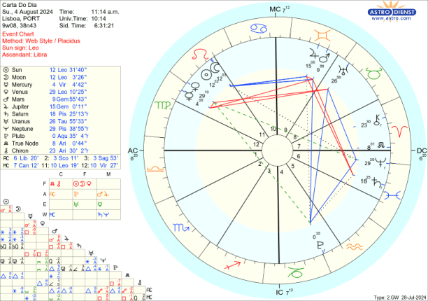 No dia 4, no segundo decanato de Leão, regido pelo planeta Júpiter, vemos nos Céus o sextil da conjunção em Leão de Sol e Lua a Júpiter, conjunto a Marte em Gémeos. Isto é sinal de que estamos a criar qualquer coisa de novo, a mostrar-nos sob uma nova luz e a exprimi-la com empenho mas também revisão da posição devido à retrogradação de Mercúrio que começa no mesmo dia e com a contenção a que a quadratura de Saturno obriga: eu sou, eu brilho, eu crio e posso afirmá-lo com conta peso e medida.