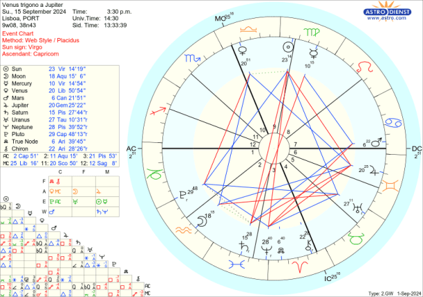 A 14, 15 e 16 deste Setembro Vénus, o planeta das relações, afectos, economia, dinheiro faz um belíssimo grande trígono a Jupiter e à Lua- exacto dia 15. Da Balança para os Gémeos e Aquário, é nos signos do Ar que se agita a fortuna, entusiasmo, potencial de entendimento, comunicação, impacto colectivo. São bons dias mas não devemos deitar foguetes antes de tempo. É preciso também prevenir porque, a 18, quarta feira abre o portal dos eclipses da rentrée com a Lua parcialmente ofuscada pelo Sol a 25 graus de Peixes, entalada entre Saturno e Neptuno, sextil a Plutão e a Urano. É a nossa sensibilidade, intuição, empatia que está em causa, temos de encontrar nova maneira de encarar o processo longo de reformas, correcções que ainda nos espera como indivíduos e como sociedade para poder entrar de pé direito no tempo de Aquário e aguentar o conflito entre as forças conservadoras e a inovação tecnológica, ideológica, etc, necessária ao progresso.
