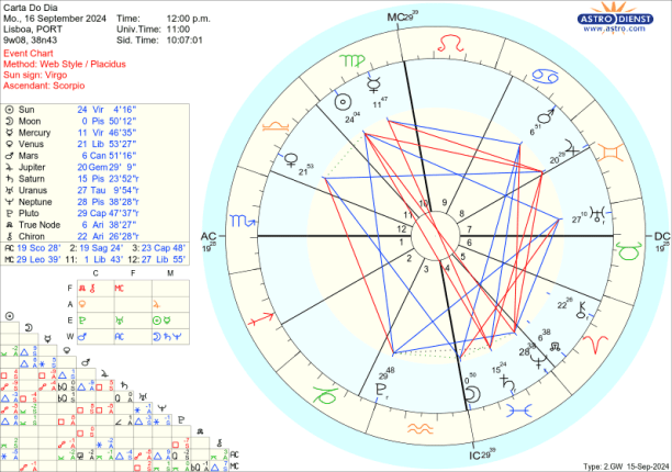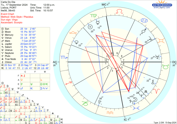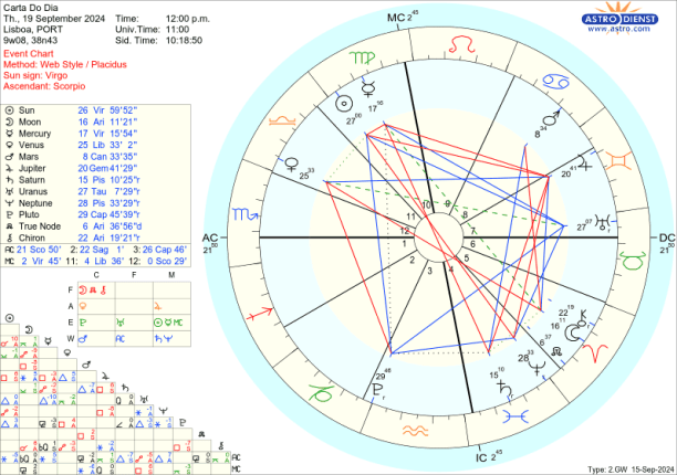 Essa demarcação de fronteiras é parte fundamental deste processo astral em curso pontuado por este eclipse na quarta feira, depois pelo equinócio e entrada do Sol em Balança no domingo e de seguida por novo eclipse, desta vez do Sol em Balança na Lua Nova do próximo dia 2 de Outubro. Trata-se de uma sequência de eventos ou constatações que nos levam a integrar que, para estar em relação, temos de respeitar os nossos limites assim como os dos outros. Nesta quarta feita percebemos onde estávamos a dar de mais. No ingresso do Sol em Balança no domingo- pelos aspectos que faz- definimos o nosso lugar nessas relações. No eclipse do Sol dia 2 – também pelos aspectos, que faz temos de incorporar o novo modo de estar, cortando laços desnecessários pendentes e definindo novas bases de segurança emocional. No entanto, o que é importa é encontrar equilíbrio pessoal e nas relações e trabalhar esses equilibrios para enfrentar as conflitos que, do colectivo, nos podem vir a afectar a vida.