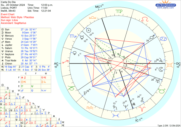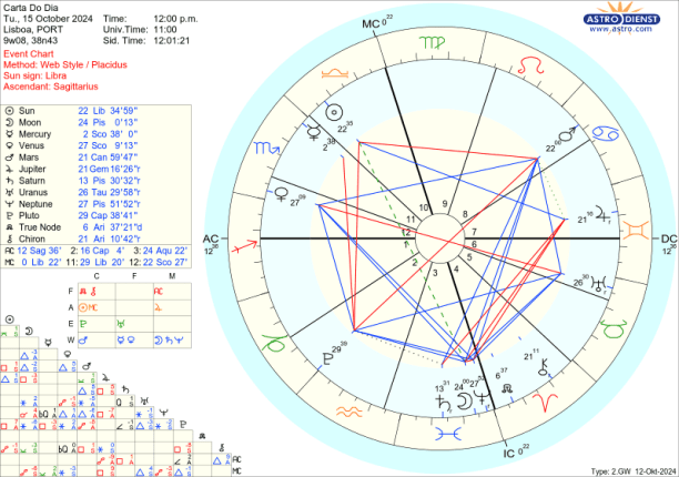 Mas até ao fim do mês e essa Lua Nova em Escorpião no dia de Novembro há mais aspectos difíceis a ter em conta…. Na tela de fundo está uma semi-quadratura entre Plutão e Saturno, marca de imensa teimosia, resistência, resiliência que agem como forças de bloqueio em cujo campo de acção se agitam as tensões dos planetas em choque nos signos cardinais. Outra constante são as quadraturas de Júpiter a Saturno e a Neptuno, verdadeiros apelos ao pragmatismo, noção da realidade e procura do verdadeiro sentido da vida. O caminho passa sempre pela acção individual, iniciativa entusiasta, com o Nódulo Norte em Carneiro mas, como Marte seu regente está em Caranguejo, o caminho é trilhado com a força das emoções, de forma oscilante, na busca de segurança no que é familiar, tradicional, conservador, nacional.