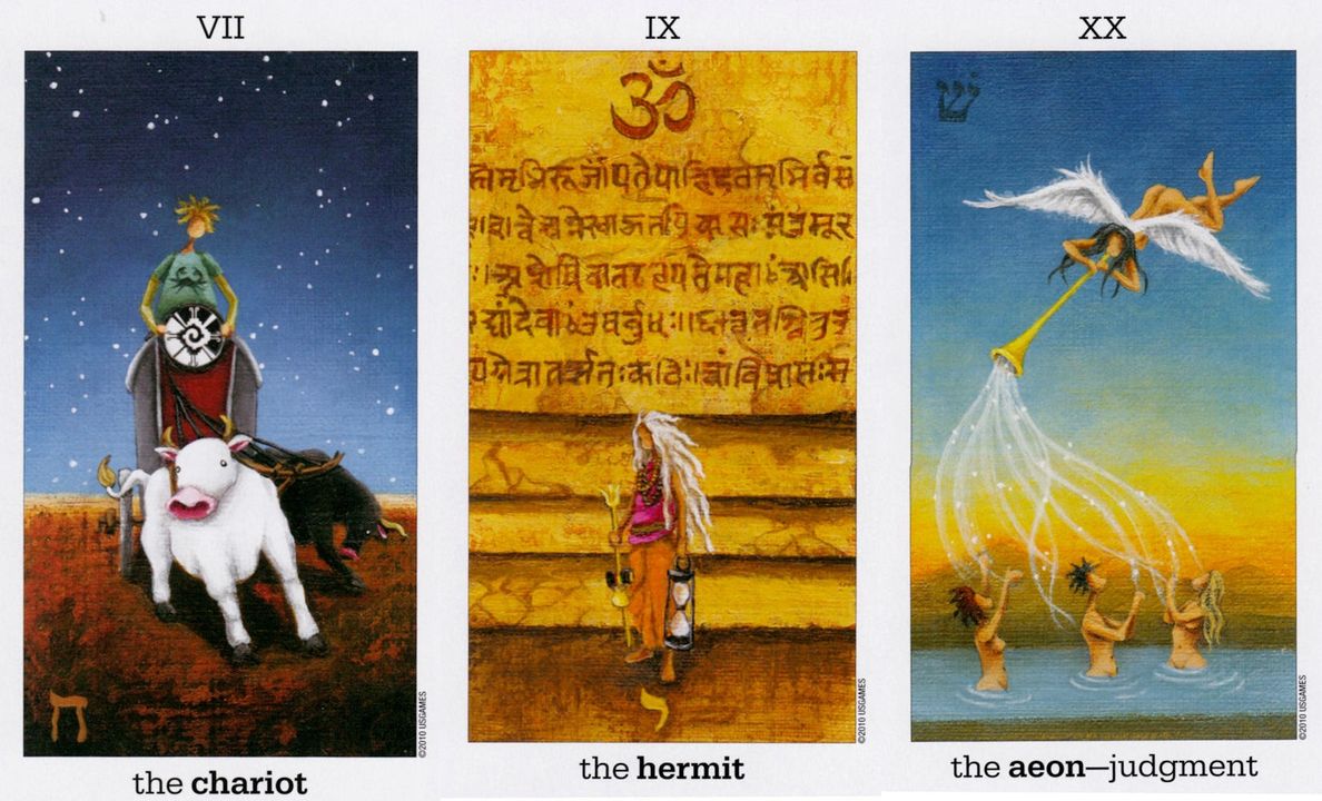 Vejamos primeiro o Carro, representante do princípio do desapego. Há um cordão umbilical que precisa de ser cortado, para fora da zona de conforto e em busca de um caminho próprio. É uma necessidade de distanciamento em relação ao que é familiar, num processo de afirmação pessoal da vontade. Sai o guerreiro armado, combativo e só, a percorrer etapas que se vão definindo durante o percurso, a cada escolha que faz. A sua única agenda é distanciar-se, como que para se certificar de que tem valor próprio, quando está fora das suas origens.