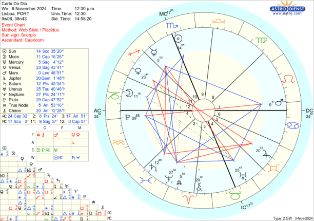 As imagens foram capturadas a 30 de Setembro mas, nem de propósito, são agora divulgadas… A Lua Nova de Escorpião de 1 de Novembro foi regida por Marte e Plutão, ambos em oposição de Caranguejo para o Capricórnio -e em grau exacto esta segunda feira mas em órbita toda a semana. Em cima de todas as guerras já em curso tememos agora uma escalada no Médio Oriente e um conflito aberto nos EUA sobre o resultado das eleições que ocorrem esta terça feira dia 5. E sabe-se lá que mais.. nos nossos horóscopos natais esse conflito nos Céus reflecte-se nas casas do mapa onde estiverem as cúspides de Leão e Capricórnio. Difícil não o estarmos a sentir na pele para além dos media..