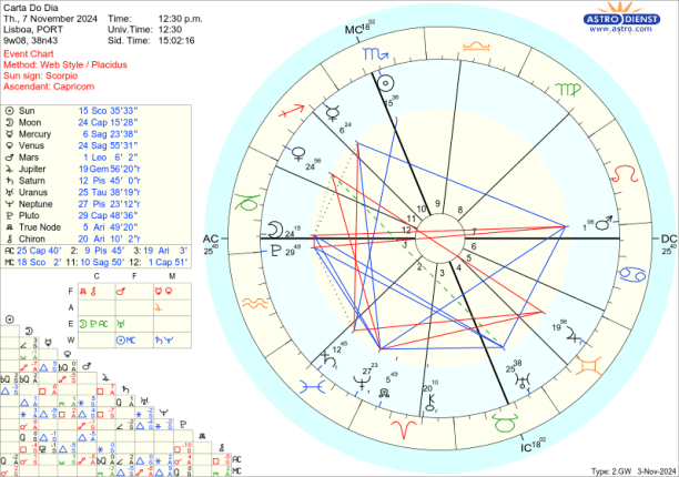 Vamos deparar-nos com ambivalência enquanto Júpiter regente dos Peixes estiver em Gémeos e variações sobre como e onde nos investirmos com Vénus regente do Touro -agora em Sagitário -oposta a Júpiter no signo dual de Gémeos. Mais ainda, temos de ter em conta que Marte vai entrar retrógrado a 7 de Dezembro, opôr-se pela segunda vez a Plutão a 3 de Janeiro, – fica directo em finais de Fevereiro- e opõe-se pela terceira vez a Plutão no final de Abril, sempre em torno da cúspide de Leão, numa prolongada ilustração da tensão actual entre o individual e o colectivo. A laia de epílogo, Saturno e Neptuno unem -se em Carneiro em finais de Maio, princípio de Junho quando Júpiter entra em Caranguejo e Urano entra em Gémeos em Julho de 2025 – seremos outros e os valores serão outros mas até lá o processo é complexo, quiçá violento.. ou talvez esteja apenas a reflectir a passagem de Phobos…