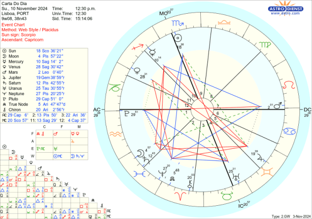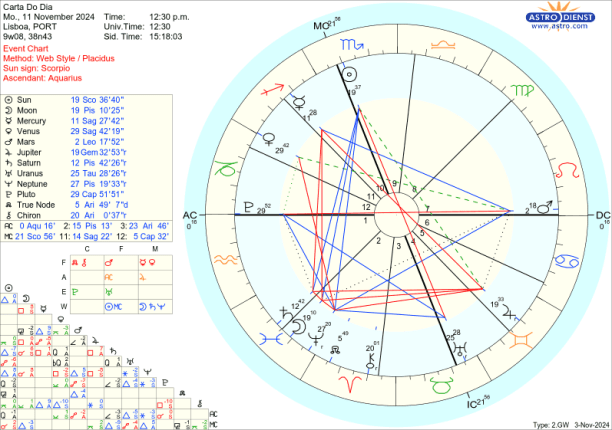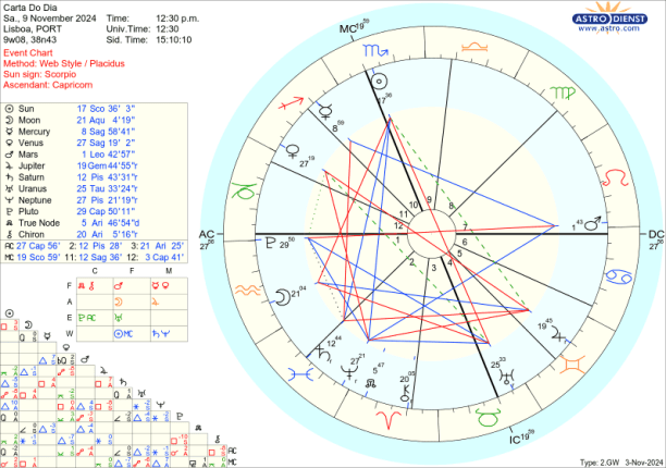 Em resumo, toda a semana temos Marte oposto a Plutão- tensão garantida como pano de fundo. Segunda e terça a Lua está em Sagitário em quadratura a Saturno e a Neptuno, sinal de que o optimismo é travado e baralhado. A Lua agrava a tensão Marte/Plutão quinta e sexta pela sua conjunção a Plutão e oposição a Marte: por estar em Capricórnio e Aquário a grande dúvida é que ordem, que sociedade se está a desenhar. Ainda em Aquário no sábado, a Lua faz quadratura ao Sol em Escorpião e quadratura a Urano em Touro: a pulsão de ruptura faz-se sentir no colectivo. Domingo a conjunção da Lua a Saturno é mais um sinal de repressão das emoções e dos ideais… Espera-nos para a semana uma Lua Cheia em Touro conjunta a Urano no dia num extremar da volatilidade que temos vindo a presenciar, com Plutão já em Aquário. (link para video de R.I. na Tribo Astral sobre Plutão que Revolução) Depois de 11 de Novembro temos duas décadas pela frente para que, em suma, esperemos, a responsabilidade pessoal seja vivida como uma responsabilidade no colectivo assim como a responsabilidade de cada país tenha em consideração o interesse global, tão importante para enfrentar por exemplo as alterações climáticas…