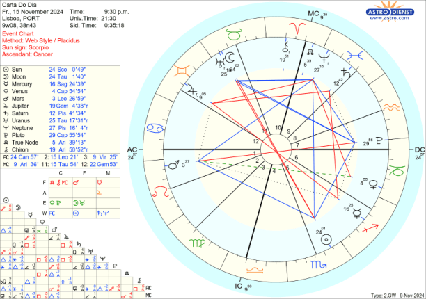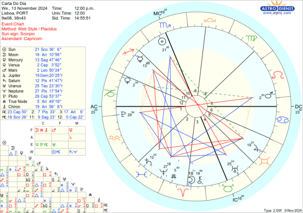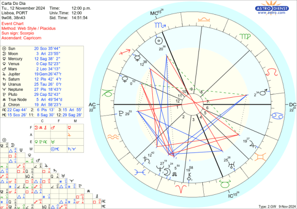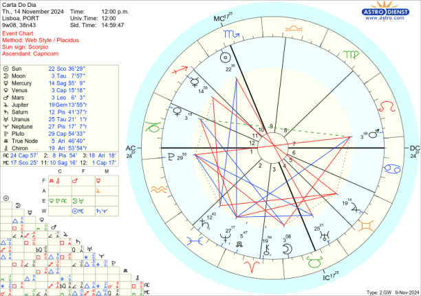 O pano de fundo é o mesmo a que temos vindo a estar sujeitos: 1- uma semi-quadratura entre Saturno e Plutão que torna tudo mais difícil; 2- uma oposição entre Marte e Plutão- agora fora de signo -e que se repete em grau exacto a 3 de Janeiro e a 26 de Abril próximo (simboliza o interesse individual em confronto com as mudanças em curso nos sistemas, muitas das quais até nem temos conhecimento dado o segredo que Plutão sempre envolve) e que pode trazer instabilidade social; 3- uma quadratura entre Júpiter e Saturno que dura até Junho 2025 e que obriga a refinar objectivos; 4 -uma quadratura entre Mercúrio em Sagitário e Saturno em Peixes, exacta esta semana na terça feira 12 que obriga a disciplina mental, não permite mentir nem nos pode deixar sucumbir ao pessimismo. No dia 12, também Vénus entra em Capricórnio e o qu devemos procurar e organizar relações e dinheiros a pensar no longo prazo.